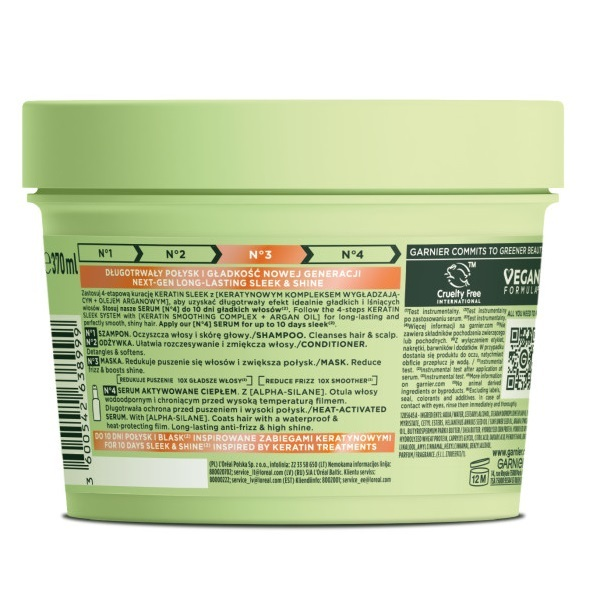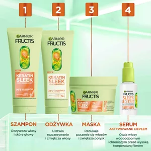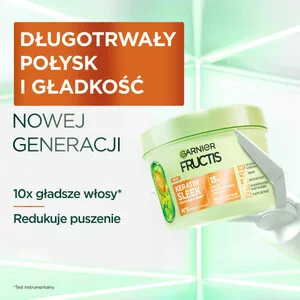Odkryj moc długotrwałego połysku i gładkości nowej generacji z Garnier Fructis Keratin Sleek - maską do włosów suchych i puszących się. Dzięki innowacyjnej formule zawierającej Keratynowy Kompleks wygładzający oraz olej arganowy, Twoje włosy staną się 10 razy gładsze* i zachowają blask na dłużej. Maska skutecznie redukuje puszenie, oferując idealnie gładkie i lśniące włosy.