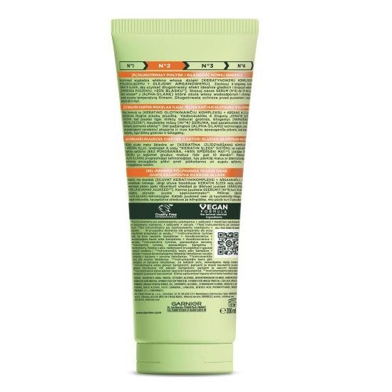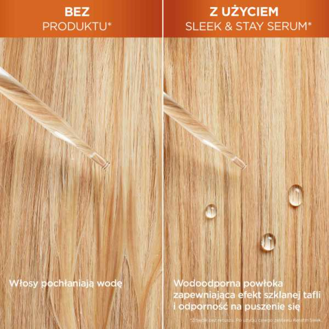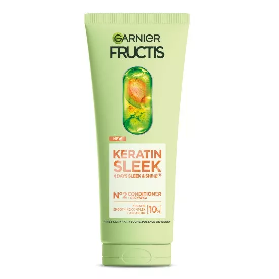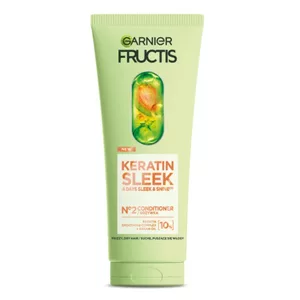 Garnier Fructis Keratin Sleek to odżywka do włosów suchych i puszących się, która oferuje długotrwały połysk i gładkość nowej generacji. Dzięki innowacyjnemu keratynowemu kompleksowi wygładzającemu oraz olejowi arganowemu, produkt natychmiast wygładza włókno włosa. Zastosuj 4-etapową kurację Keratin Sleek, aby uzyskać efekt idealnie gładkich i lśniących włosów.