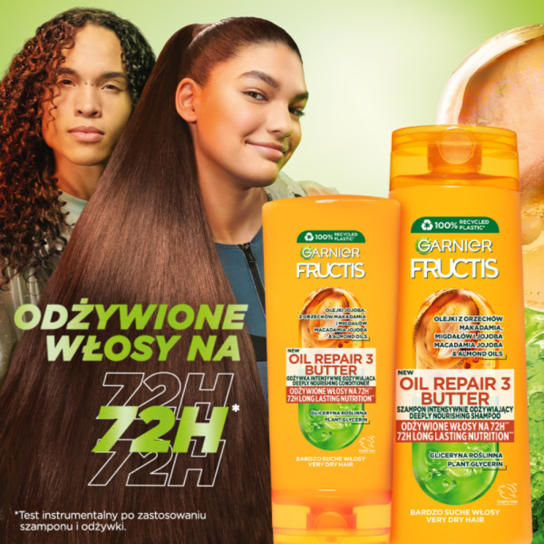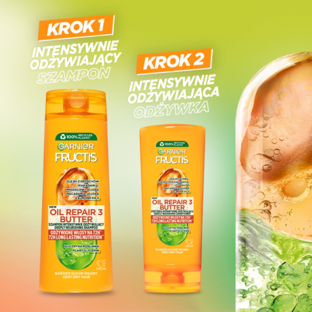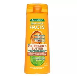 Garnier Fructis Oil Repair 3 Butter to szampon intensywnie odżywiający, który został stworzony, aby zapewnić widocznie zdrowsze i mocniejsze włosy. Formuła tego szamponu łączy w sobie białka z cytryny, witaminy B3 i B6 oraz ekstrakty z owoców i roślin o udowodnionej skuteczności. Dzięki zawartości olejków z jojoby, orzechów makadamii oraz orzechów migdałów, pomaga intensywnie odżywić włosy, zapewniając im miękkość, blask i siłę.