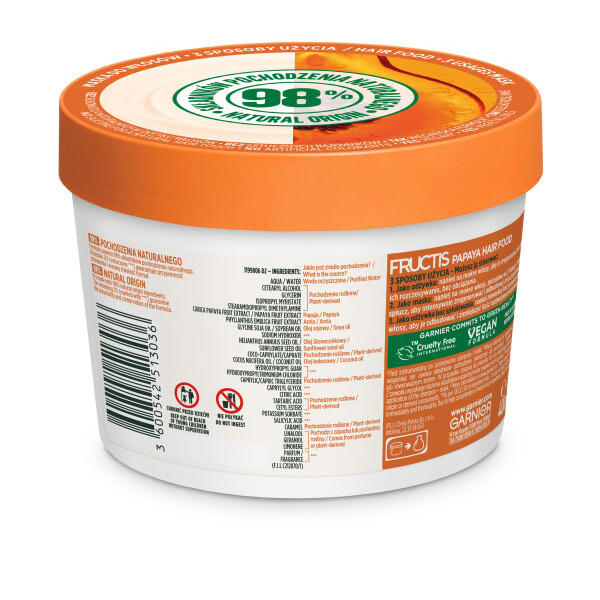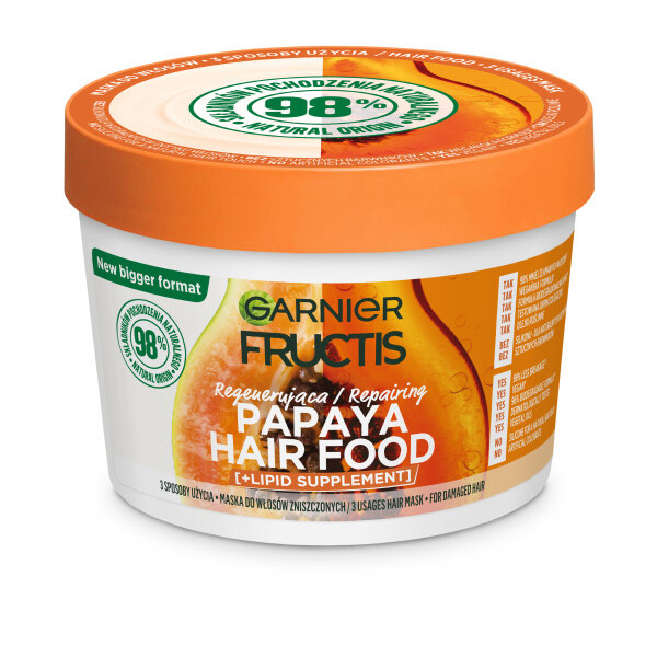 Regenerująca maska do włosów zniszczonych Garnier Fructis Papaya Hair Food to idealne rozwiązanie dla osób poszukujących skutecznej pielęgnacji włosów. Dzięki tej masce możesz cieszyć się nawet o 98% mniej złamanymi włosami*. Jej formuła jest w pełni wegańska** i w 98% biodegradowalna***, co czyni ją przyjazną dla środowiska. Maska zawiera olejki roślinne i 98% składników pochodzenia naturalnego, zapewniając intensywną regenerację i odbudowę włosów.
