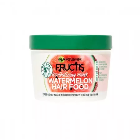 Garnier Fructis Watermelon Hair Food to rewitalizująca maska do włosów cienkich, która oferuje intensywną pielęgnację dzięki swojej wegańskiej* i w 98% biodegradowalnej** formule. Ten produkt zawiera aż 97% składników pochodzenia naturalnego, a pozostałe 2% to składniki zapewniające przyjemność stosowania i trwałość formuły. Dzięki zawartości olejków roślinnych, maska intensywnie rewitalizuje włosy, nadając im miękkość i zdrowy wygląd. Możesz używać jej na trzy sposoby: jako odżywkę, maskę lub pielęgnację bez spłukiwania.