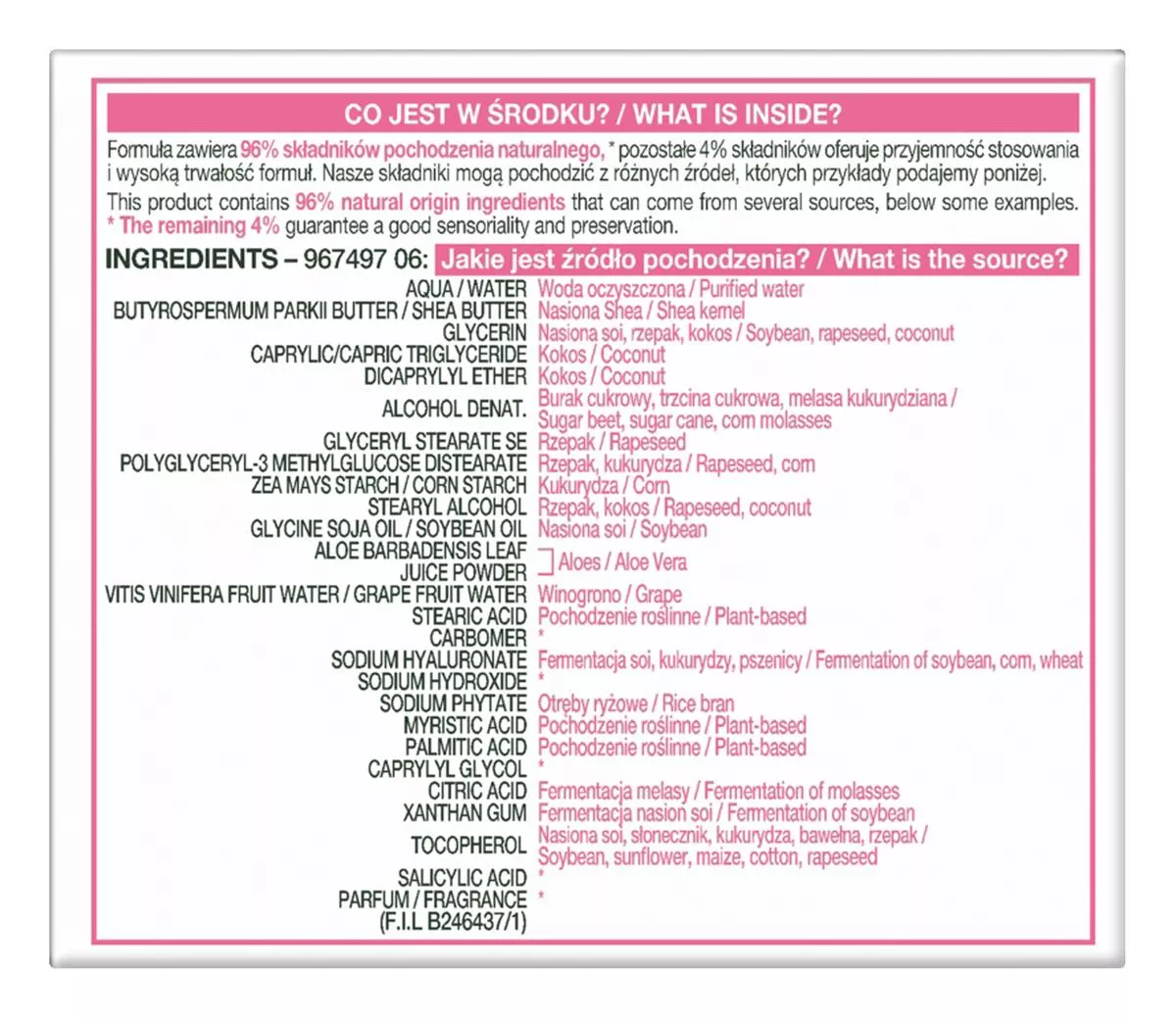 967497 06 - Aqua / Water • Butyrospermum Parkii Butter / Shea Butter • Glycerin • Caprylic/capric Triglyceride • Dicaprylyl Ether • Alcohol Denat. • Glyceryl Stearate Se • Polyglyceryl-3 Methylglucose Distearate • Zea Mays Starch / Corn Starch • Stearyl Alcohol • Glycine Soja Oil / Soybean Oil • Aloe Barbadensis Leaf Juice Powder • Vitis Vinifera Fruit Water / Grape Fruit Water • Stearic Acid • Carbomer • Sodium Hyaluronate • Sodium Hydroxide • Sodium Phytate • Myristic Acid • Palmitic Acid • Caprylyl Glycol • Citric Acid • Xanthan Gum • Tocopherol • Salicylic Acid • Parfum / Fragrance (f.i.l. B246437/1).