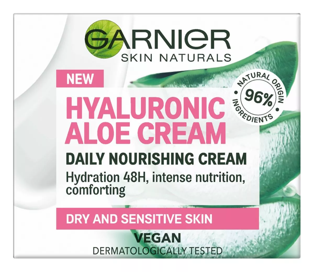 Jeśli szukasz intensywnego nawilżenia, wypróbuj odżywczy krem Garnier Hyaluronic Aloe z organicznym ekstraktem z aloesu oraz kwasem hialuronowym naturalnego pochodzenia, zdolnym wiązać 1000 razy więcej wody niż sam waży. Krem nawilża przez 48 godzin*, koi i regeneruje skórę. Lekka, kremowa konsystencja szybko się wchłania, pozostawiając uczucie komfortu. Idealny jako baza pod makijaż, zawiera 96% składników pochodzenia naturalnego, a pozostałe 4% zapewnia sensoryczność i trwałość formuły. Przeznaczony do skóry suchej i wrażliwej. Produkt testowany dermatologicznie i wegański.