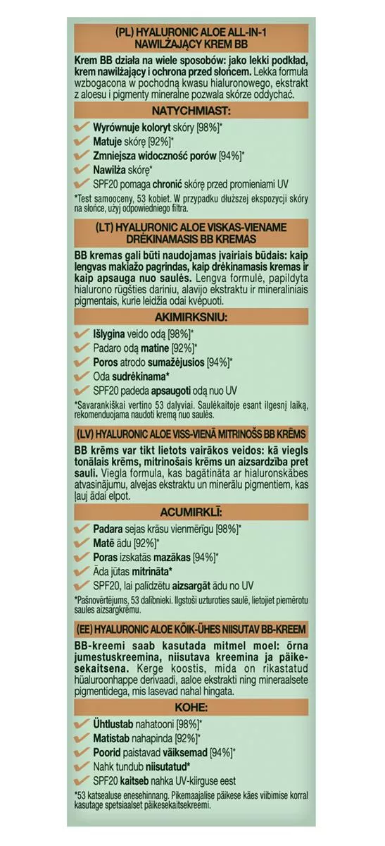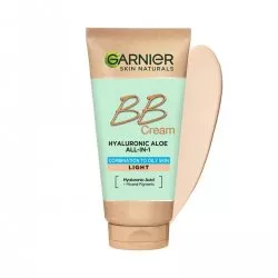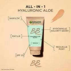 Garnier Hyaluronic Aloe Nawilżający krem BB to wielozadaniowy produkt idealny dla skóry tłustej i mieszanej. Łączy w sobie funkcje lekkiego podkładu, kremu nawilżającego i ochrony przeciwsłonecznej. Dzięki lekkiej formule wzbogaconej o pochodną kwasu hialuronowego, ekstrakt z aloesu oraz pigmenty mineralne, pozwala skórze oddychać i dba o jej zdrowy wygląd.