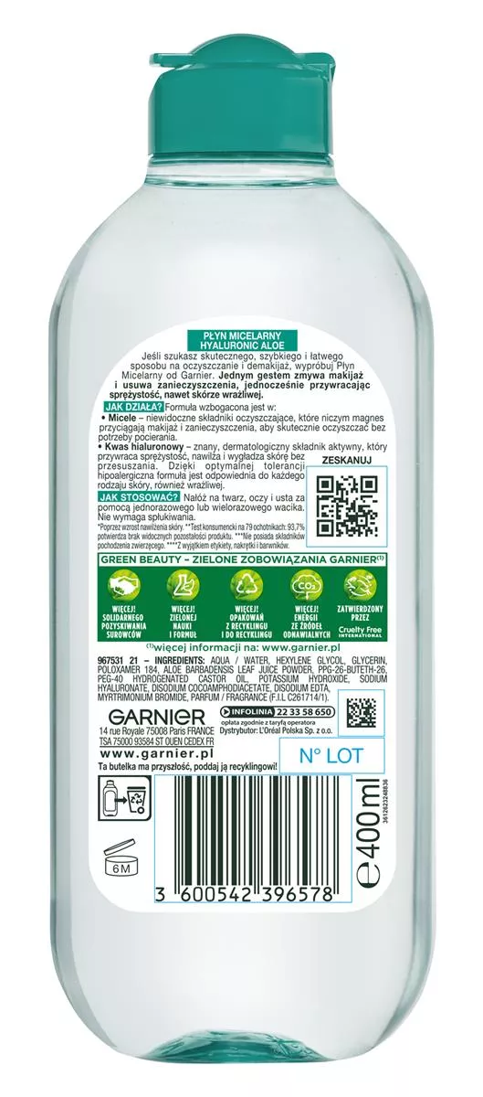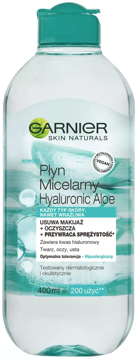 Odkryj moc oczyszczania i demakijażu dzięki Garnier Hyaluronic Aloe Płyn Micelarny z kwasem hialuronowym i ekstraktem z aloesu. Ten innowacyjny produkt w pojemności 400 ml zapewnia skuteczne usuwanie makijażu i zanieczyszczeń jednym gestem, przywracając jednocześnie sprężystość i nawilżenie nawet najbardziej wrażliwej skórze.