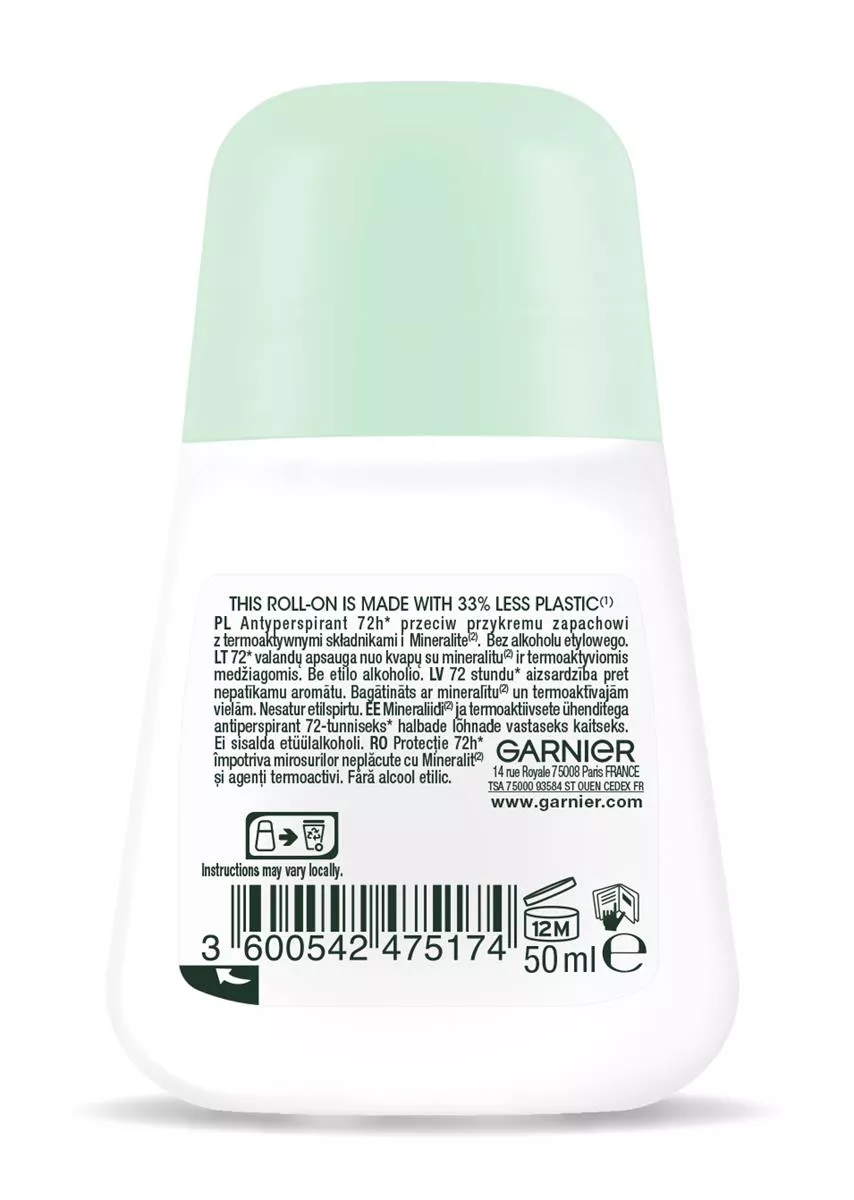 Garnier Mineral AC Thermic Dezodorant roll-on 50ml to wyjątkowy antyperspirant od Garnier, wzbogacony o ekstrakt z termoaktywnymi składnikami oraz opatentowanym Mineralite* naturalnego pochodzenia, wydobywanym ze skały wulkanicznej. Dzięki zdolności do absorpcji 2,5 razy więcej wody niż sam waży, Mineralite jest 5 razy bardziej absorbujący niż talk, co zapewnia skórze optymalną ochronę przed przykrym zapachem i wilgocią. Formuła produktu respektuje naturalną transpirację skóry, pozwalając jej oddychać, i została przetestowana w ekstremalnych warunkach. Dezodorant zapewnia 72-godzinną ochronę przed przykrym zapachem i wilgocią, nie zawiera alkoholu etylowego i jest testowany dermatologicznie.