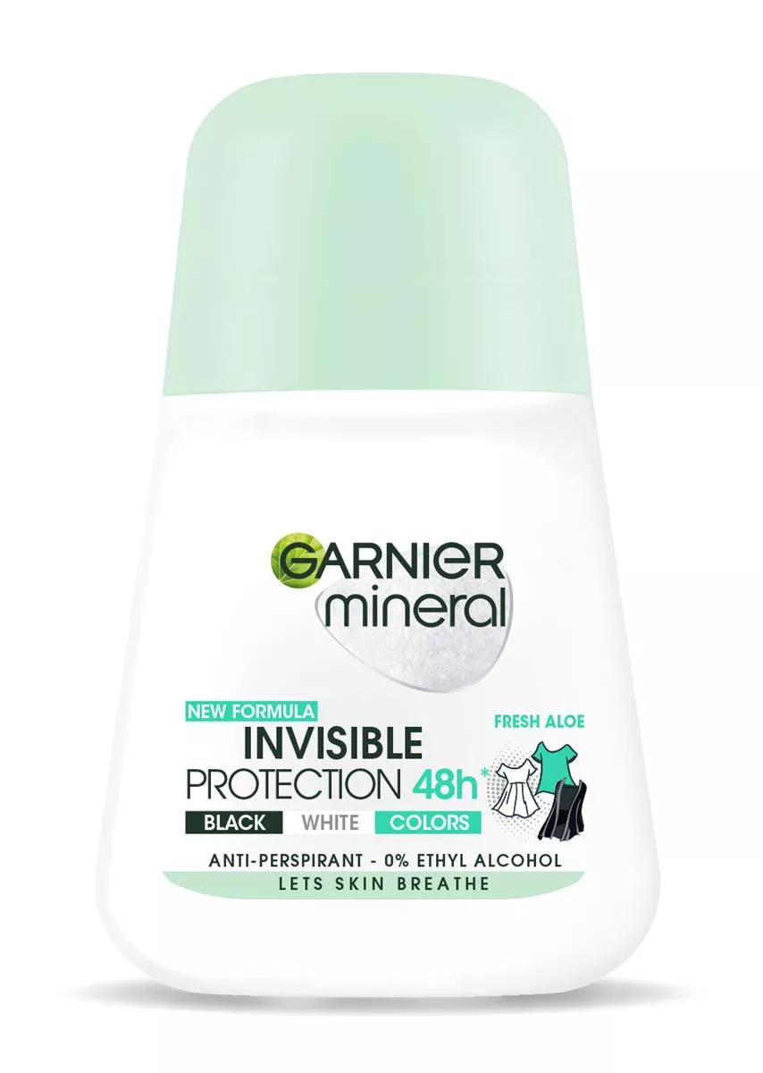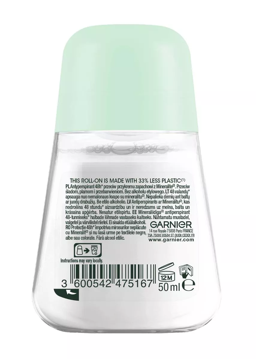 Garnier Mineral BWC Fresh Aloe Dezodorant roll-on 50ml to pierwszy antyperspirant od Garnier z opatentowanym Mineralite*, naturalnego pochodzenia, wydobywanym ze skały wulkanicznej. Ten wyjątkowy składnik jest zdolny do absorbcji 2,5 razy więcej wody niż sam waży, co czyni go 5 razy bardziej absorbującym niż talk. Dezodorant respektuje naturalną transpirację skóry, zapewniając optymalną ochronę przed przykrym zapachem i wilgocią, jednocześnie pozwalając skórze oddychać. Produkt nie pozostawia śladów na tkaninach, jest wolny od alkoholu etylowego i testowany dermatologicznie.