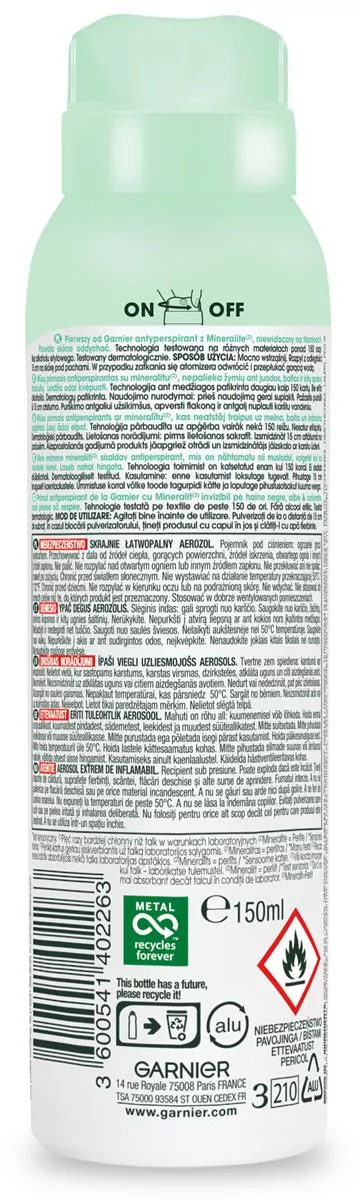 Garnier Mineral BWC Fresh Aloe Dezodorant w sprayu 150ml to innowacyjny antyperspirant z ekstraktem z Moringi i opatentowanym składnikiem Mineralite*, pochodzącym ze skały wulkanicznej. Mineralite ma niezwykłą zdolność do absorbcji 2,5 razy więcej wody niż sam waży i jest 5 razy bardziej absorbujący niż talk, co zapewnia optymalną ochronę przed przykrym zapachem i wilgocią, jednocześnie respektując naturalną transpirację skóry. Dezodorant nie pozostawia śladów na tkaninach, jest bez alkoholu etylowego i został przetestowany dermatologicznie, co czyni go bezpiecznym wyborem dla Twojej skóry.