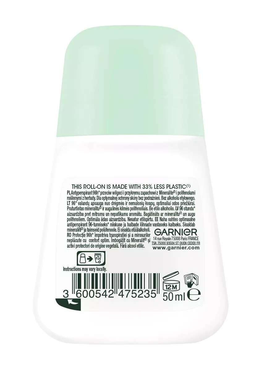 Garnier Mineral Clinically Tested Dezodorant roll-on 50ml to pierwszy antyperspirant od Garnier, który optymalnie dba o skórę, zapobiegając podrażnieniom po goleniu. Formuła wzbogacona jest o opatentowany Mineralite* naturalnego pochodzenia, wydobywany z skały wulkanicznej. Mineralite jest w stanie zaabsorbować 2,5 razy więcej wody niż sam waży, co czyni go 5 razy bardziej absorbującym niż talk. Dezodorant respektuje naturalną transpirację skóry, zapewniając optymalną ochronę przed przykrym zapachem i wilgocią, jednocześnie pozwalając skórze oddychać. Produkt nie zawiera alkoholu etylowego i jest testowany dermatologicznie.