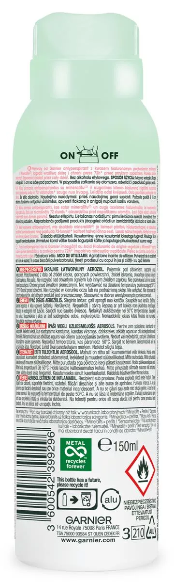 Garnier Mineral Hyaluronic Care Dezodorant w sprayu 150ml to wyjątkowy produkt, który został stworzony z myślą o osobach z wrażliwą skórą pod pachami. Zapewnia ochronę przed przykrym zapachem aż do 72 godzin, jednocześnie pozwalając skórze oddychać i zapewniając jej komfort przez cały dzień.