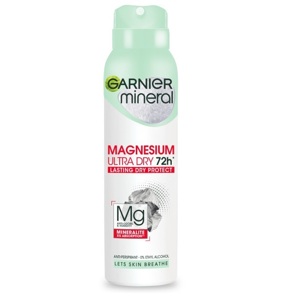 Garnier Mineral Magnesium UD Dezodorant w sprayu 150ml to innowacyjny antyperspirant, który łączy w sobie moc tlenku magnezu i opatentowanego Mineralite* naturalnego pochodzenia, wydobywanego ze skały wulkanicznej. Dzięki wyjątkowej zdolności do absorpcji, Mineralite* potrafi wchłonąć 2,5 razy więcej wody niż sam waży, co czyni go 5 razy bardziej skutecznym niż talk. Produkt zapewnia optymalną ochronę przed przykrym zapachem i wilgocią, jednocześnie pozwalając skórze oddychać. Gwarantuje 72-godzinną ochronę przed nieprzyjemnym zapachem, a jego formuła nie zawiera alkoholu etylowego i jest testowana dermatologicznie.