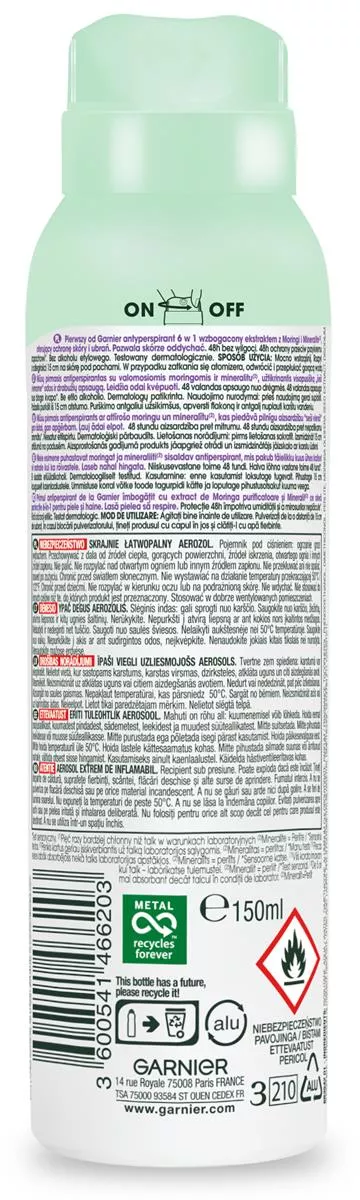 Garnier Mineral P6 Floral Dezodorant w sprayu 150ml to innowacyjny antyperspirant, który łączy w sobie ekstrakt z Moringi oraz opatentowany Mineralite* pochodzenia naturalnego, pozyskiwany ze skały wulkanicznej. Ten zaawansowany składnik jest zdolny do absorpcji aż 2,5 razy więcej wody niż sam waży oraz jest 5 razy bardziej efektywny niż talk. Dezodorant ten zapewnia optymalną ochronę przed nieprzyjemnym zapachem i wilgocią, jednocześnie pozwalając skórze oddychać. Produkt nie zawiera alkoholu etylowego, nie pozostawia śladów na tkaninach i jest testowany dermatologicznie.