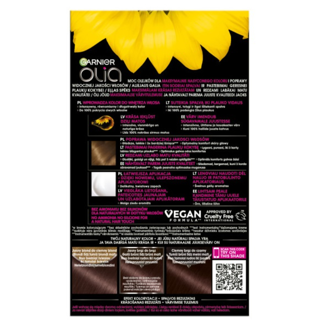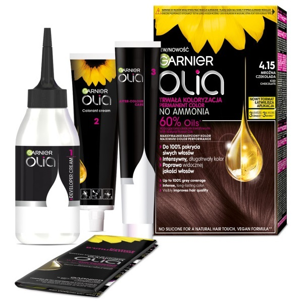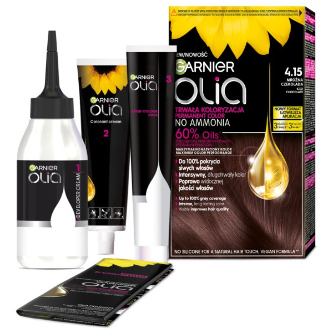 Garnier Olia farba do włosów 4.15 Mroźna Czekolada to wyjątkowa trwała koloryzacja, która łączy w sobie innowacyjność i troskę o kondycję włosów. Dzięki wzbogaceniu olejkami kwiatowymi, produkt zapewnia intensywny kolor i do 100% pokrycia siwych włosów*, jednocześnie poprawiając ich jakość i blask.