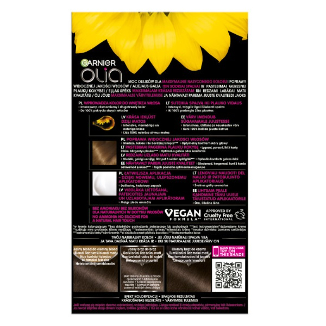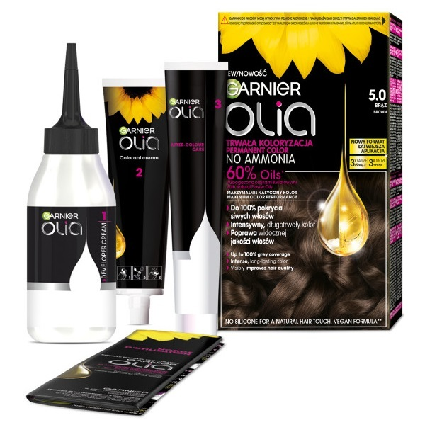 Garnier Olia farba do włosów 5.0 Brąz to innowacyjna trwała koloryzacja wzbogacona olejkami kwiatowymi. Gwarantuje maksymalnie nasycony kolor i aż do 100% pokrycia siwych włosów*. Dzięki formule wzbogaconej olejkami, krem koloryzujący wprowadza intensywny, równomierny i długotrwały kolor do wnętrza włosa, zapewniając widoczną poprawę jakości włosów. Twoje włosy będą gładsze, lekkie i do 3x bardziej lśniące*.