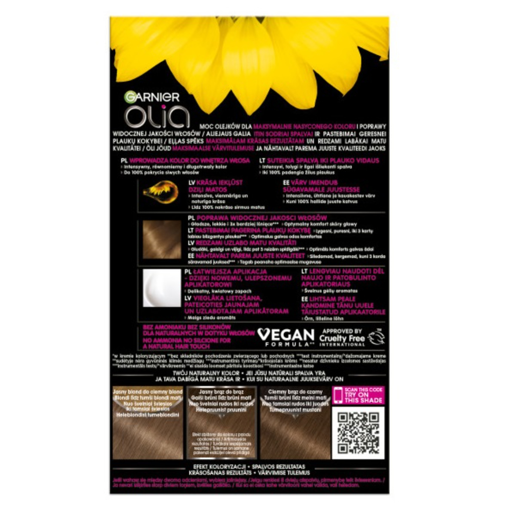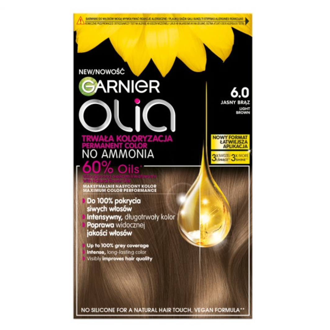 Garnier Olia farba do włosów 6.0 Jasny Brąz to innowacyjna trwała koloryzacja wzbogacona olejkami kwiatowymi. Ten produkt zapewnia wyjątkowo nasycony kolor oraz aż do 100% pokrycia siwych włosów, jednocześnie poprawiając jakość Twoich włosów. Dzięki formule wzbogaconej o olejki, kolor jest intensywny, równomierny i długotrwały, a włosy stają się gładsze, lżejsze i do 3 razy bardziej lśniące. Aplikacja jest teraz jeszcze prostsza!
