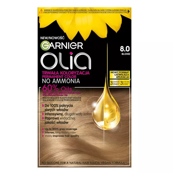 Garnier Olia farba do włosów 8.0 Blond to innowacyjna, trwała koloryzacja wzbogacona olejkami kwiatowymi, która zapewnia maksymalnie nasycony kolor i aż do 100% pokrycia siwych włosów*. Dzięki unikalnej formule z olejkami, farba wnika w głąb włosa, oferując intensywny, równomierny i długotrwały kolor, jednocześnie poprawiając jakość włosów, czyniąc je gładszymi, lżejszymi i do 3 razy bardziej lśniącymi*. Proces koloryzacji jest teraz jeszcze łatwiejszy dzięki dołączonemu aplikatorowi.