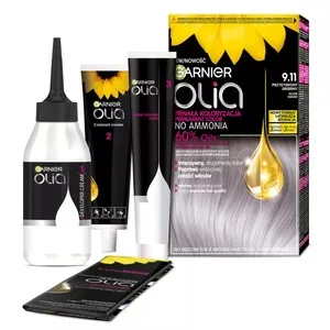 Garnier Olia farba do włosów 9.11 Przydymiony Srebrny to innowacyjna, trwała koloryzacja, która została wzbogacona olejkami kwiatowymi. Dzięki temu produktowi uzyskasz maksymalnie nasycony kolor oraz aż do 100% pokrycia siwych włosów*. Olejki w kremie koloryzującym wprowadzają intensywny, równomierny i długotrwały kolor do wnętrza włosa, co widocznie poprawia jakość włosów, czyniąc je gładszymi, lekkimi i do 3 razy bardziej lśniącymi*.