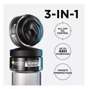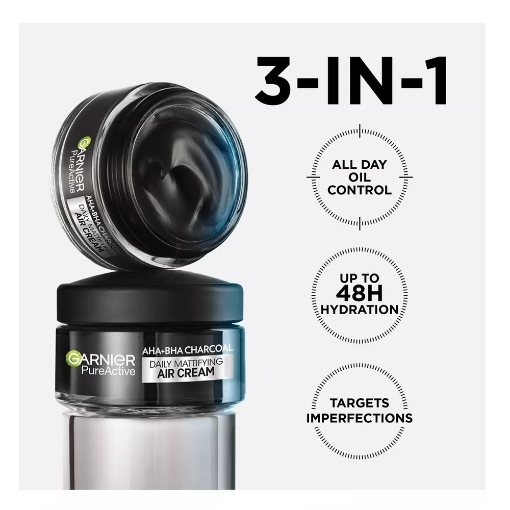Garnier Pure Active lekki krem matujący AHA + BHA + Węgiel to matujący żel-krem do codziennego stosowania, który zapewnia działanie 3w1. Widocznie redukuje przebarwienia, zapewnia całodniową kontrolę sebum oraz 48-godzinne nawilżenie, pozostawiając skórę matową przez cały dzień.