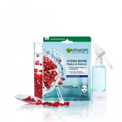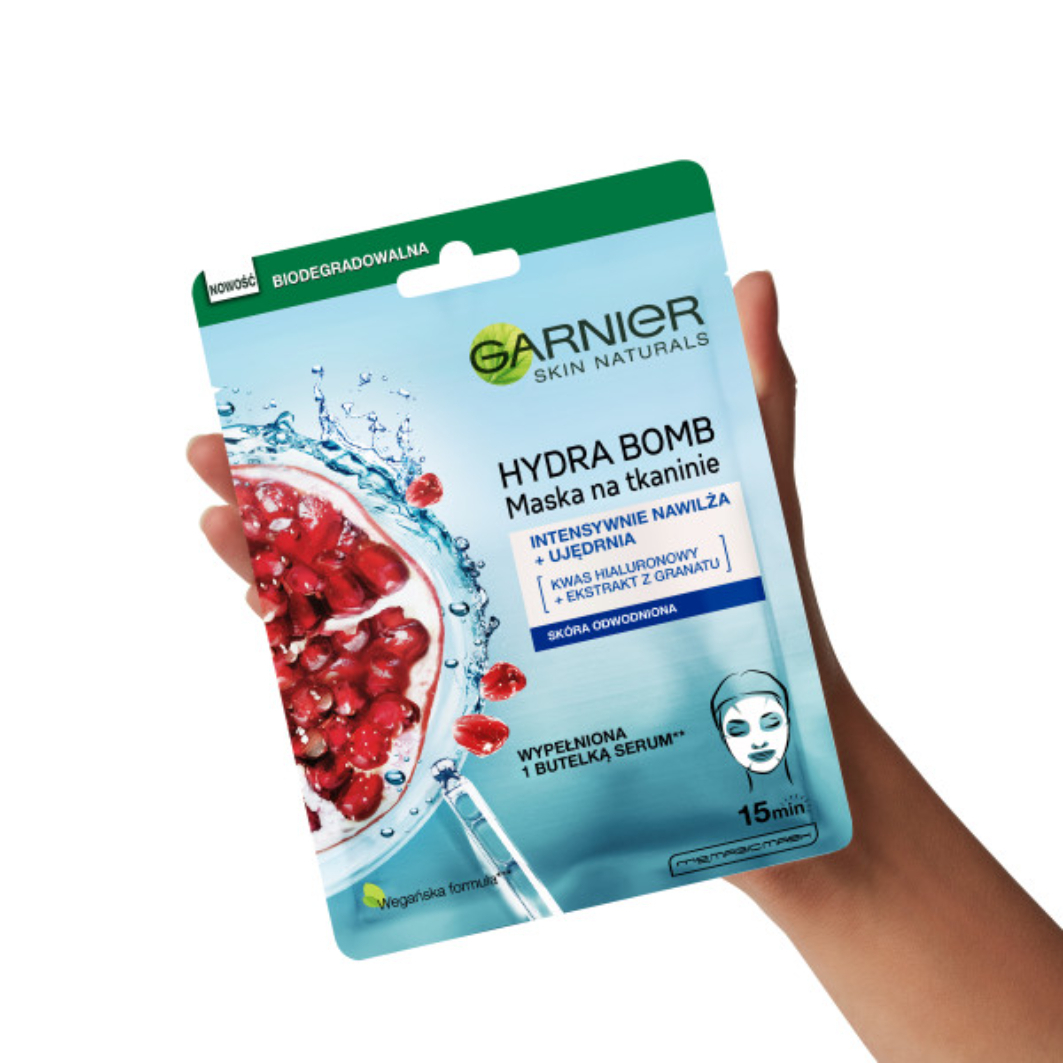 Garnier Skin Naturals Hydra Bomb Maska na tkaninie to intensywnie nawilżająca formuła wzbogacona o ekstrakt z granatu i kwas hialuronowy. Już po 15 minutach skóra staje się widocznie wygładzona, jędrna i pełna blasku. Produkt jest odpowiedni dla każdego typu skóry, w tym odwodnionej, a jego wegańska formuła nie zawiera składników pochodzenia zwierzęcego. Tkanina maski jest biodegradowalna w warunkach domowego kompostowania, co czyni ją przyjazną dla środowiska.
