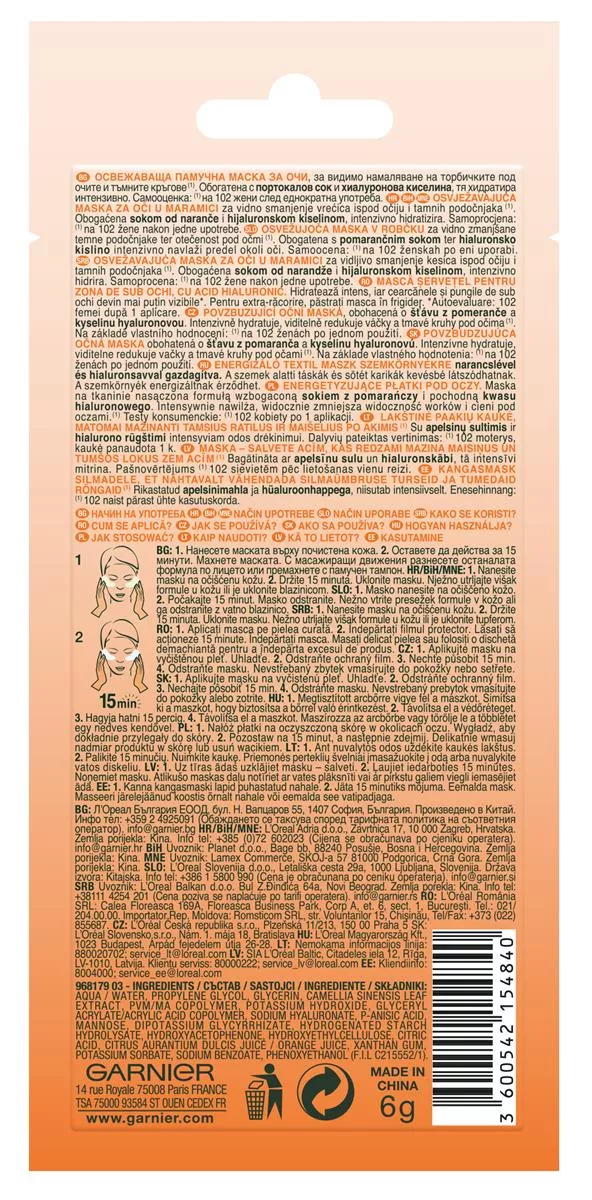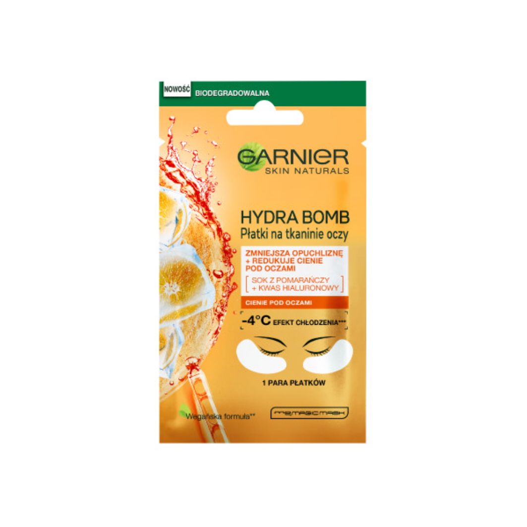 Odkryj innowacyjne płatki na tkaninie Garnier Skin Naturals Hydra Bomb, stworzone specjalnie do redukcji cieni pod oczami. Formuła wzbogacona sokiem z pomarańczy i pochodną kwasu hialuronowego działa błyskawicznie, aby nawilżyć suchą i zmęczoną skórę oraz wygładzić pierwsze oznaki starzenia. Po zaledwie 15 minutach Twoja skóra będzie wyglądać na bardziej nawilżoną i zrelaksowaną. Dla uzyskania najlepszego efektu chłodzącego zalecamy przechowywanie maski w lodówce przed użyciem. Produkt jest wegański i wykonany z biodegradowalnej tkaniny, co czyni go przyjaznym dla środowiska.