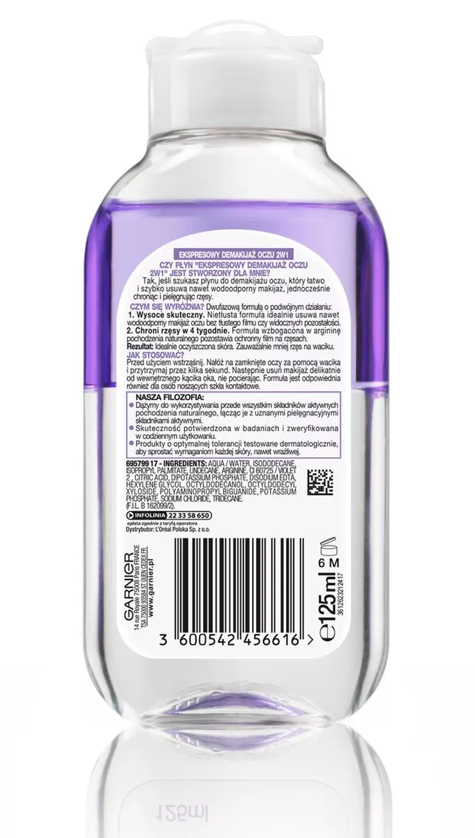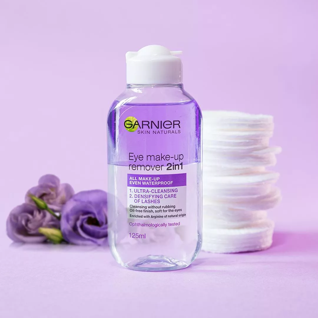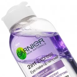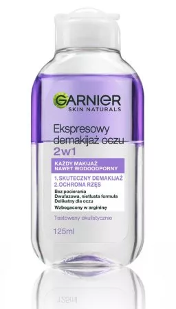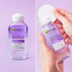 Jeśli szukasz wyjątkowo skutecznego, szybkiego i łatwego sposobu na oczyszczanie i demakijaż, wypróbuj Płyn do demakijażu oczu 2w1 w formule dwufazowej od Garnier. Jednym gestem zmywa makijaż, jednocześnie chroniąc i pielęgnując rzęsy. Dwufazowa formuła została wzbogacona w olejek arganowy naturalnego pochodzenia, dzięki czemu gwarantuje ekspresowy demakijaż bez potrzeby pocierania. Zawartość olejku zapewnia także wysoką wydajność i pielęgnacyjne właściwości dla Twoich rzęs. Nie musisz trzeć, by pozbyć się makijażu! Rezultat? Zauważalnie mniej rzęs na waciku podczas demakijażu.