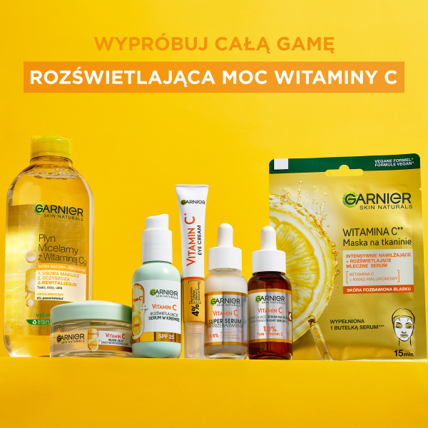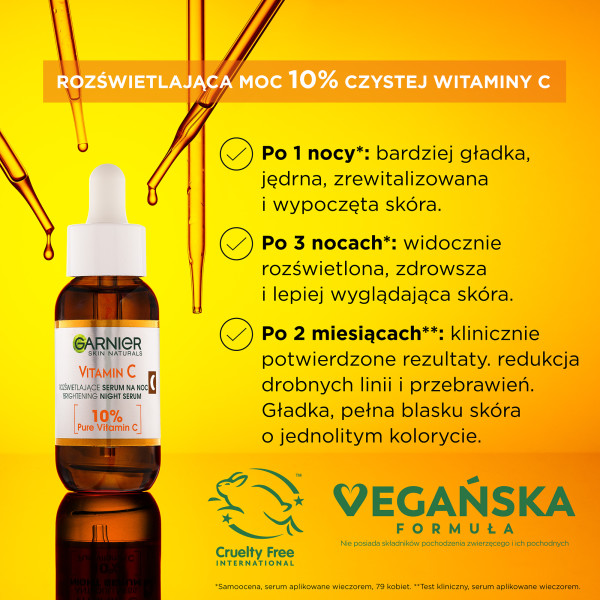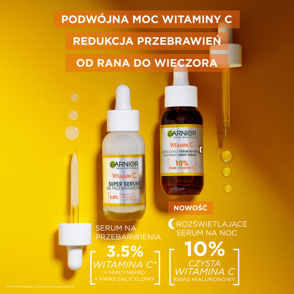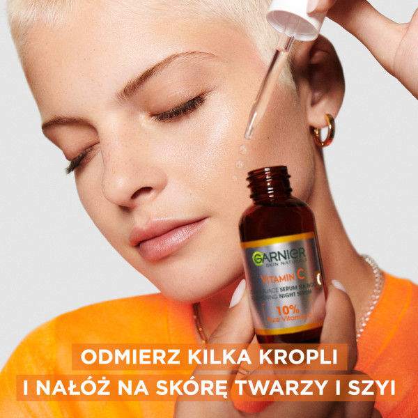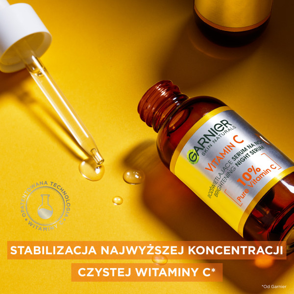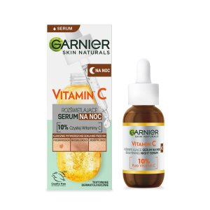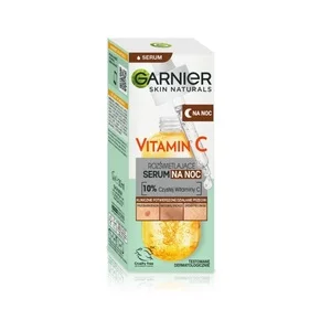 Odkryj moc rozświetlenia z Garnier Skin Naturals Vitamin C rozświetlającym serum na noc, które zawiera najwyższą koncentrację 10% czystej witaminy C oraz kwas hialuronowy. To zaawansowane serum widocznie rozświetla matową i zmęczoną skórę podczas nocy, kiedy jest ona najbardziej podatna na regenerację. Obudź się z pełną blasku, gładką i wypoczętą skórą już po zaledwie trzech nocach stosowania!