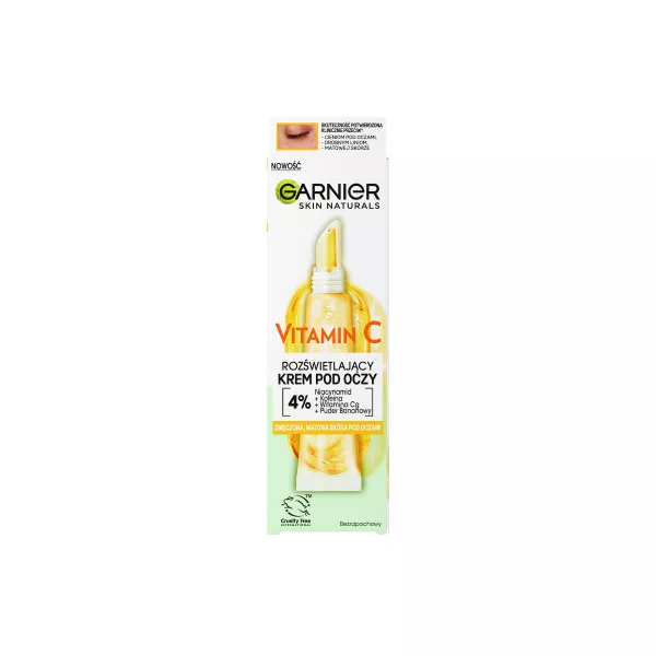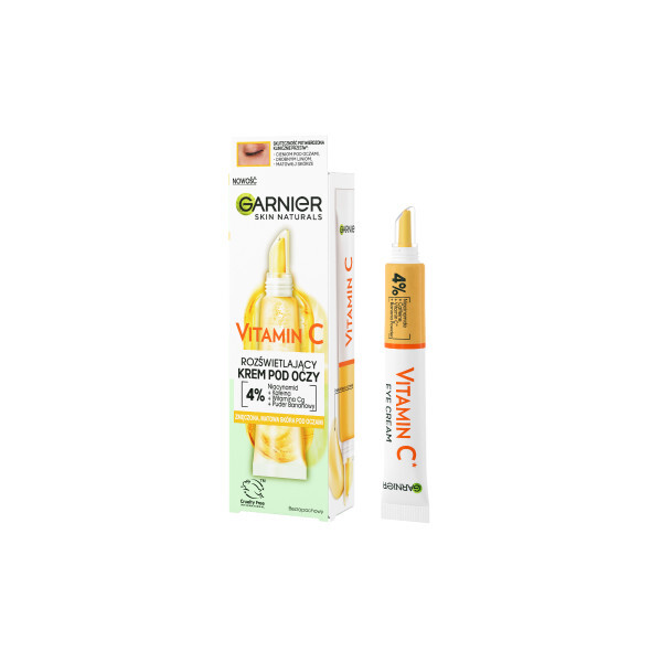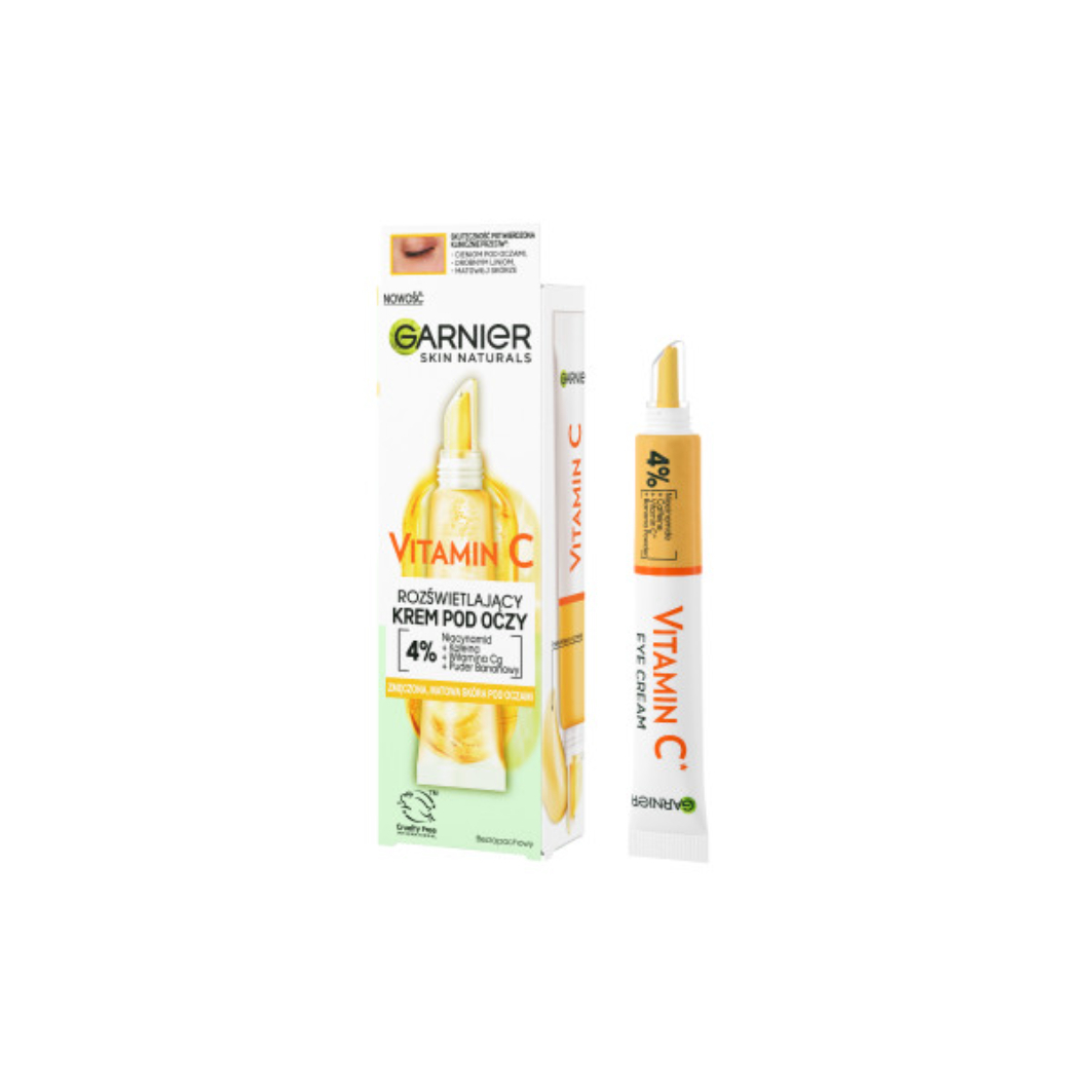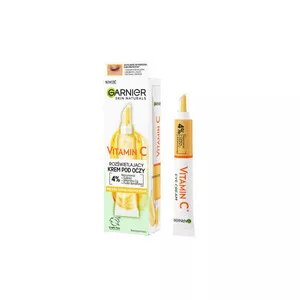 Garnier Skin Naturals Vitamin C rozświetlający krem pod oczy to innowacyjny produkt stworzony z myślą o redukcji oznak zmęczenia, cieni pod oczami i drobnych linii. Dzięki silnie skoncentrowanej 4% formule zawierającej niacynamid, kofeinę, witaminę Cg oraz puder bananowy, skóra pod oczami nabiera świeżego i wypoczętego wyglądu.