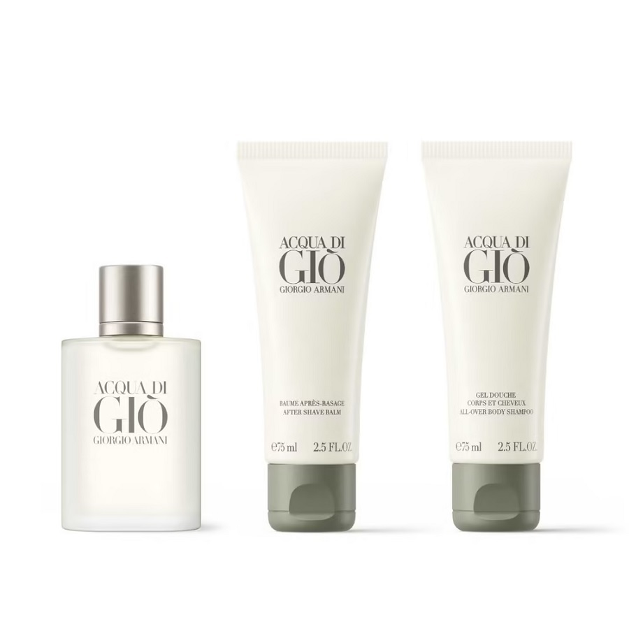 Zestaw Giorgio Armani Acqua di Gio Pour Homme to wyjątkowa propozycja dla mężczyzn ceniących sobie świeżość, elegancję i luksus. W skład zestawu wchodzą trzy produkty z kultowej linii Acqua di Gio: woda toaletowa o pojemności 50 ml, żel pod prysznic 75 ml oraz balsam po goleniu 75 ml. Kompozycja zapachowa inspirowana jest śródziemnomorską bryzą, łącząc zmysłowe nuty wodne z subtelnymi akordami kwiatowymi i ciepłem bursztynu. To idealny wybór na prezent lub jako codzienny rytuał pielęgnacyjny dla nowoczesnego mężczyzny o złożonej osobowości.
