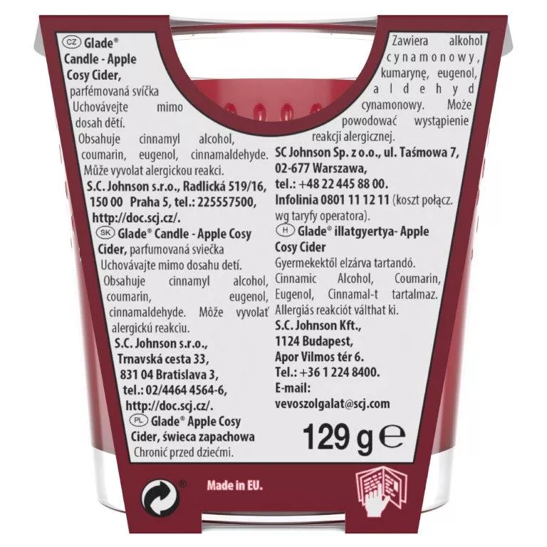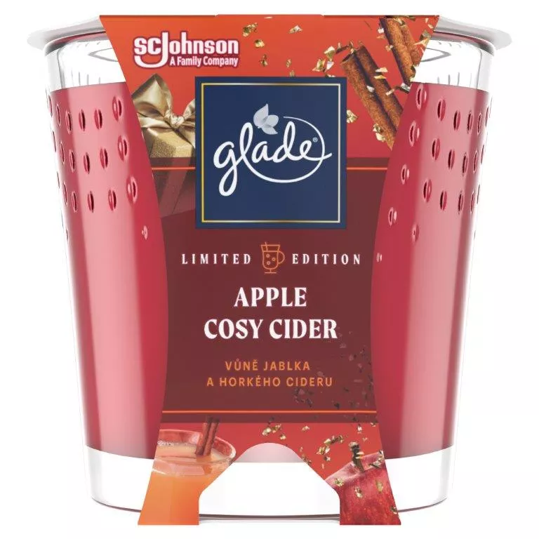 Glade Apple Cosy Cider. Dopraw swoje otoczenie aromatycznym jabłkiem i świeżym, zachęcającym cydrem. Przedstawiamy nasze najnowsze świece zapachowe Glade. Poczuj pozytywną energię w twoim pomieszczeniu dzięki świeżym, oryginalnym zapachom, który zostały zaprojektowane tak, aby łaskotać Twoją zabawną stronę i zwalczać nieprzyjemne zapachy.