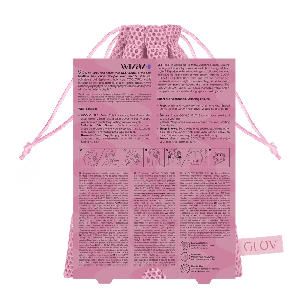 Spełnij marzenie o zdrowych, lśniących lokach bez użycia wysokiej temperatury! Glov Dream Curl to innowacyjny zestaw do stylizacji włosów na zimno, zawierający bezpieczny dla włosów wałek Satin COOLCURL™ oraz satynowy czepek GLOV® Anti-Frizz. Zestaw pozwala na uzyskanie pięknych, zdefiniowanych loków podczas snu, jednocześnie chroniąc włosy przed puszeniem, łamaniem i plątaniem. Dzięki zastosowaniu wysokiej jakości satyny oraz miękkiej pianki memory foam, stylizacja staje się nie tylko skuteczna, ale także niezwykle komfortowa i delikatna nawet dla włosów długich i wymagających.