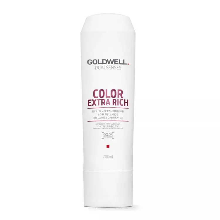 Odżywka Goldwell Dualsenses Color Extra Rich przeznaczona jest do pielęgnacji włosów farbowanych, naturalnych, grubych i opornych. Kosmetyk natychmiast wydobywa połysk koloru oraz rozplątuje i ułatwia rozczesywanie. Swoje działanie opiera na technologii microPROtec complex z wbudowaną ochroną koloru, która w równomierny sposób rozprowadza składniki pielęgnacyjne. Dzięki temu efekt odżywienia jest odczuwalny natychmiast. Ponadto udoskonalona FadeStopFormula redukuje wypłukiwanie się koloru w trakcie mycia włosów. Całkowitą innowacją zastosowaną w tej serii jest technologia Luminescine, która przemienia niewidzialne światło UV w widoczne światło dla niezrównanej promienistości koloru.