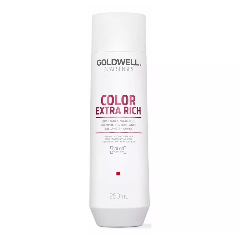 Szampon Goldwell Dualsenses Color Extra Rich przeznaczony jest do pielęgnacji włosów farbowanych, naturalnych, grubych i opornych. Kosmetyk natychmiast wydobywa połysk koloru. Swoje działanie opiera na technologii microPROtec complex z wbudowaną ochroną koloru, która w równomierny sposób rozprowadza składniki pielęgnacyjne. Dzięki temu efekt odżywienia jest odczuwalny natychmiast. Ponadto udoskonalona FadeStopFormula redukuje wypłukiwanie się koloru w trakcie mycia włosów. Całkowitą innowacją zastosowaną w tej serii jest technologia Luminescine, która przemienia niewidzialne światło UV w widoczne światło dla niezrównanej promienistości koloru.
