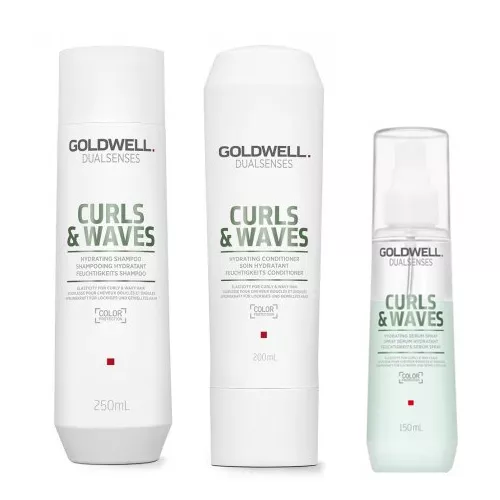 Szampon Goldwell Dualsenses Curl & Waves przeznaczony jest do pielęgnacji włosów falowanych, kręconych i trwale przekształconych. Produkt zapewnia nawilżenie oraz podkreśla loki. Dzięki lekkiej formule gwarantuje lekką sprężystość i naturalną elastyczność. Odżywka Goldwell Dualsenses Curl&Waves przeznaczona jest do pielęgnacji włosów falowanych, kręconych i trwale przekształconych. Znacznie ułatwia rozczesywanie oraz rozplątuje włosy. Serum w sprayu Goldwell Dualsenses Curl & Waves doskonale wzmacnia pasma, niweluje problem puszenia oraz uwydatnia naturalne walory loków. Serum zabezpiecza włosy przed szkodliwym działaniem wysokiej temperatury.