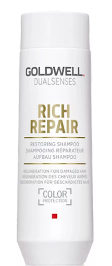 Szampon odbudowujący Goldwell Dualsenses Rich Repair powstał z myślą o pielęgnacji włosów suchych i zniszczonych. Kosmetyk wnika głęboko i regeneruje nawet mocno zniszczone włosy, dodając im pięknego blasku. W składzie szamponu znajduje się technologia FadeStopFormula, która zabezpiecza włosy farbowane przed wypłukiwaniem się koloru. Ponadto IntraLipid Complex odbudowuje włosy od wewnątrz, uzupełnia braki lipidowe i zapewnia doskonałe wzmocnienie.