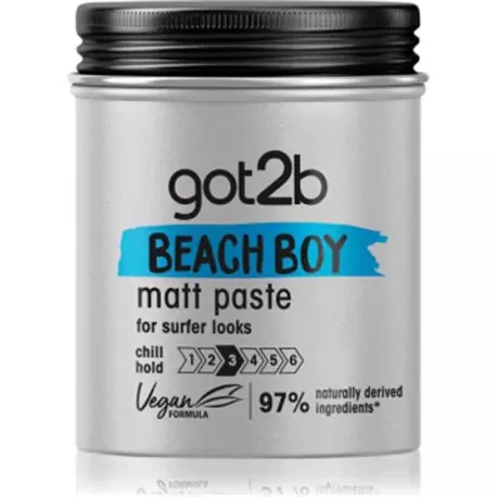 Wyznaczaj trendy w świecie unikalnych fryzur dzięki Got2B Beach Boy Pasta do Włosów Matująca Surfer Look. Czy chcesz być ciągle na fali? Ta pasta do włosów Schwarzkopf got2b Beach Boy zapewni Ci plażową fryzurę, jakbyś zszedł prosto z deski do surfowania. Nieważne, czy Twoje włosy mają być potargane, poskromione, czy proste - najważniejsze, że są matowe i bardzo mocno utrwalone!