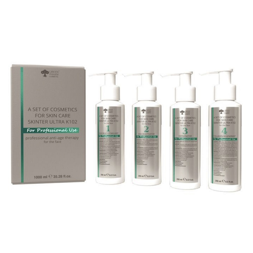 Zestaw kosmetyczny Green Pharm Cosmetic Skinter Ultra K102 o pojemności 1000 ml to profesjonalny system pielęgnacji skóry, który łączy cztery starannie opracowane etapy, zapewniając pełną regenerację, odmłodzenie oraz intensywne nawilżenie skóry twarzy i ciała. Każdy etap bazuje na zaawansowanych składnikach aktywnych, takich jak kwasy AHA, kolagen oraz kwas hialuronowy, by skóra była wygładzona, elastyczna i odżywiona już po jednym zabiegu.