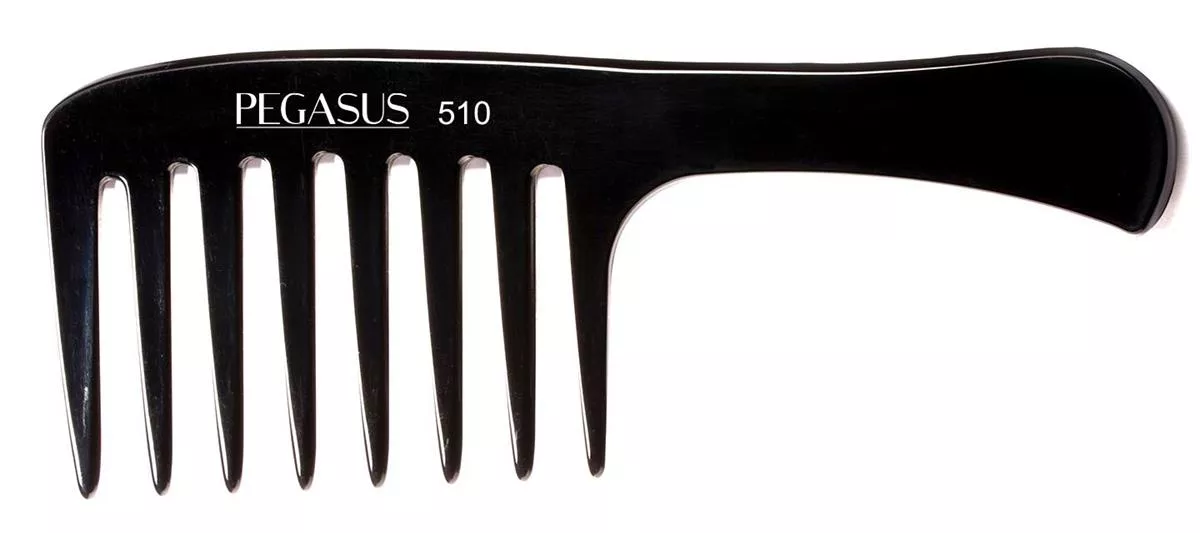 Grzebień barberski Pegasus 510 przeznaczony jest do strzyżenia. Wykonany został z twardego kauczuku, który jest lekki i wytrzymały zarazem. Grzebień przeciwdziała elektryzowaniu się włosów. Narzędzie jest odporne na działanie wysokich temperatur, a także na działanie wilgoci. Wzmocnienie włóknami węglowymi sprawia, że narzędzie to jest jeszcze solidniejsze. Grzebień posiada specjalne ząbki bezszwowe, co zapobiega podrażnianiu skóry głowy. Poza tym podczas strzyżenia włosy nie są szarpane, nie łamią się i nie niszczą.