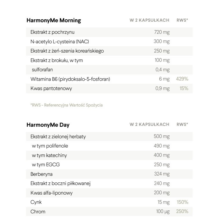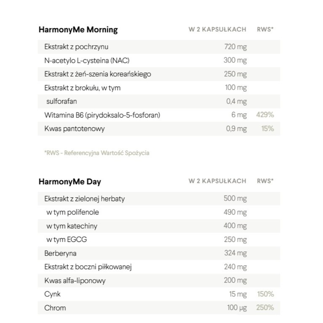 - HarmonyMe Day: dorośli – 2 kapsułki w ciągu dnia, po posiłku. Nie spożywać na czczo.