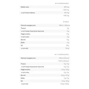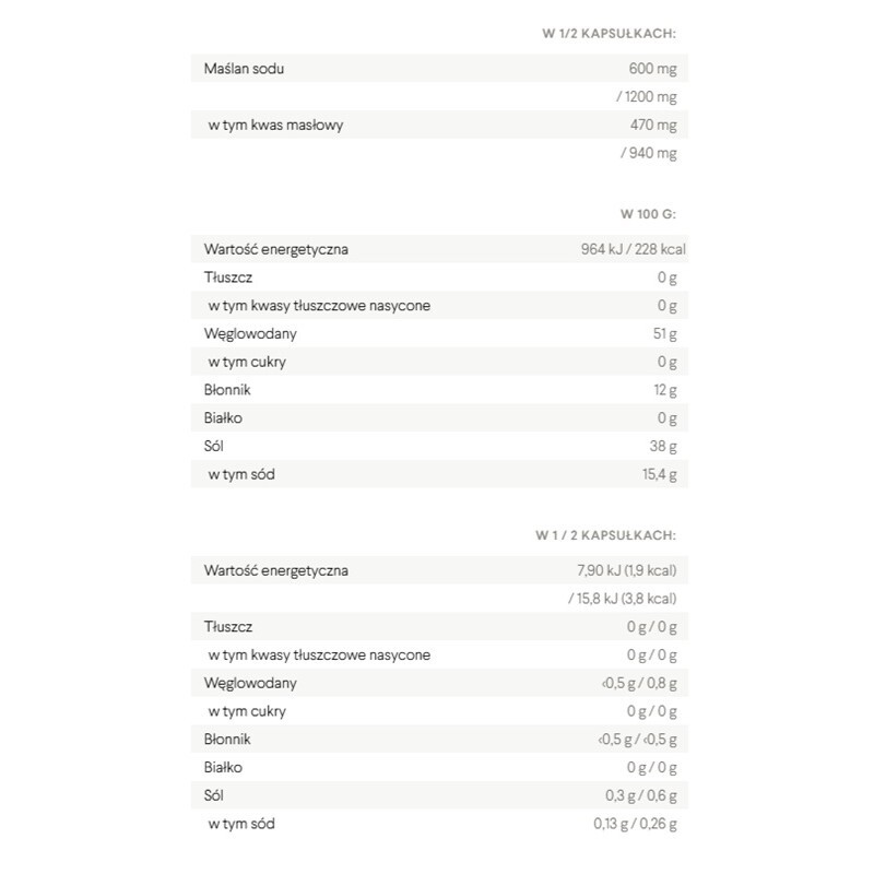 - Wysoka zawartość maślanu sodu – w dziennej porcji (2 kapsułki) aż 1200 mg, w tym 940 mg kwasu masłowego