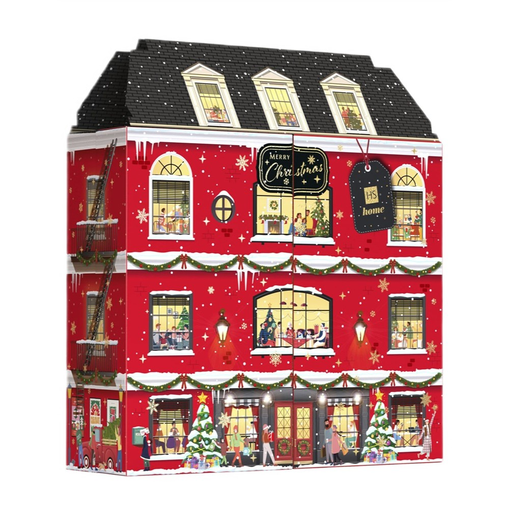- Opakowanie w formie zimowej kamienicy z okienkami, przez które możesz podejrzeć świąteczne życie jej mieszkańców – doskonały element dekoracyjny na grudniowe dni.