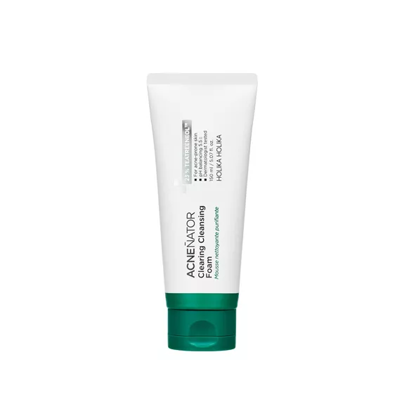 Holika Holika Acnenator Clearing Cleansing Foam to oczyszczająca pianka stworzona specjalnie dla skóry problematycznej i tłustej. Dzięki zawartości 23% Tea Treeneol™, składającego się z 4-terpineolu i ekstraktu z liści drzewa Manuka, pianka skutecznie łagodzi podrażnienia, wspiera regulację zdrowego pH skóry oraz działa antybakteryjnie. Formuła wzbogacona o kwas BHA pomaga redukować nadmiar sebum, zmniejsza zaczerwienienia i przebarwienia, jednocześnie nie powodując uczucia ściągnięcia skóry, a zapewniając jej odpowiednie nawilżenie.