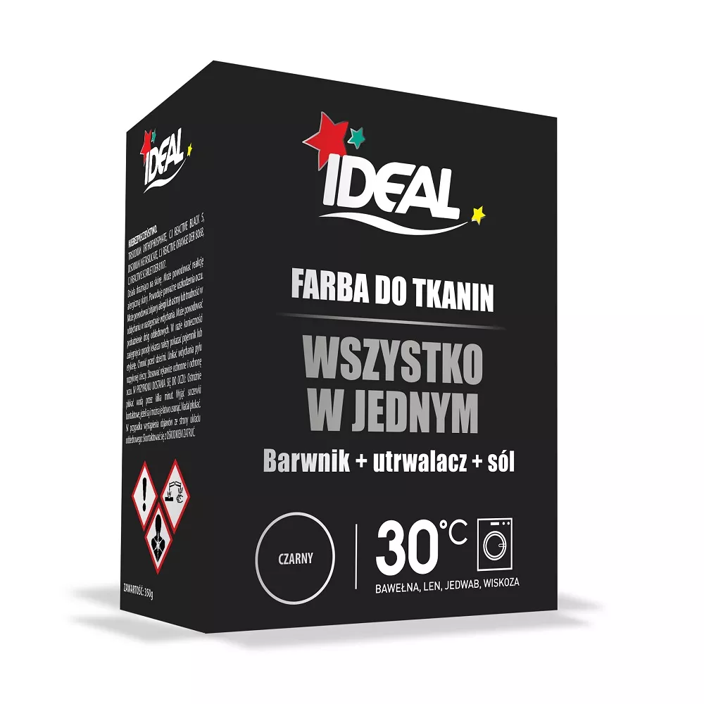 Odkryj Ideal All in One barwnik do tkanin Czarny 350g – innowacyjne rozwiązanie do barwienia wszystkich rodzajów tkanin. Dzięki formule ALL IN ONE, zawierającej barwnik, utrwalacz i sól, uzyskasz jednolity kolor w zaledwie jednej czynności, już od temperatury 30°C.