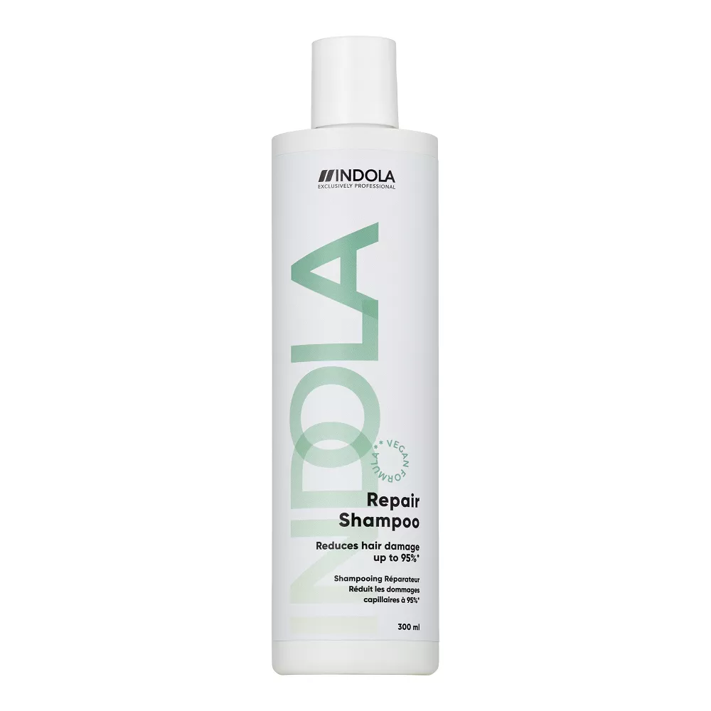 Regenerujący Szampon Repair INDOLA, opracowany na bazie wegańskiej alternatywy keratyny, oczyszcza i odżywia zniszczone i porowate włosy, jednocześnie nawet o 95%* chroniąc je przed uszkodzeniami – do zwiększenia wewnętrznej siły włosów, ich elastyczności i zdrowo wyglądającego połysku. Formuła wegańska**.