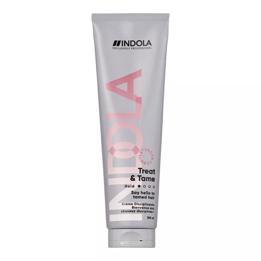 INDOLA Treat & Tame to krem do stylizacji włosów z gliceryną, z dodatkową ochroną przed działaniem wilgoci i temperatury do 230°C, który wygładza puszące się włosy, przywracając ich kontrolę. Formuła wegańska*.