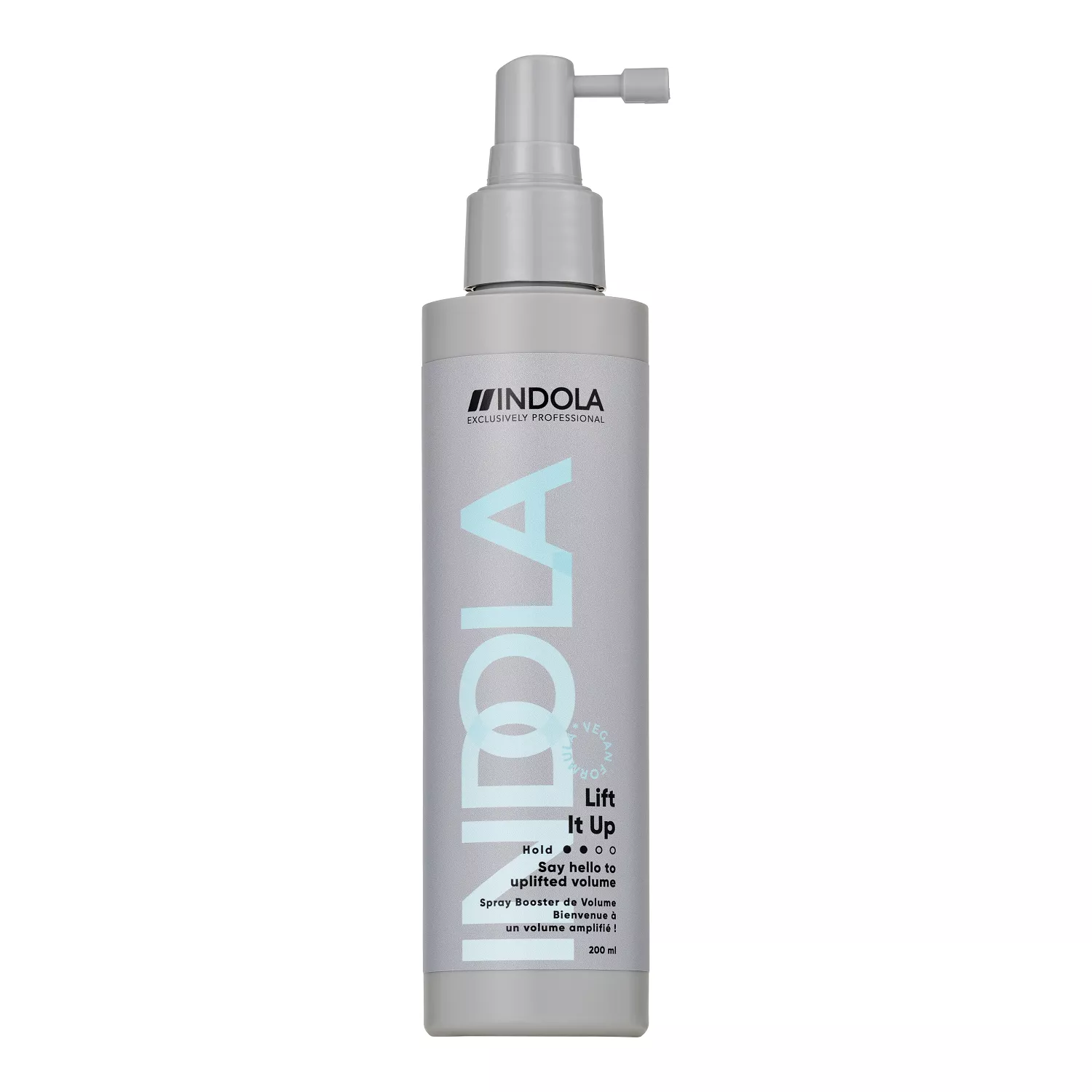 Zawierający pantenol i glicerynę spray INDOLA Lift It Up zwiększa objętość i chroni włosy przed przesuszeniem. Innowacyjna kierunkowa dysza umożliwia aplikację blisko skóry głowy, zapewniając maksymalne uniesienie włosów u nasady. Formuła wegańska*.