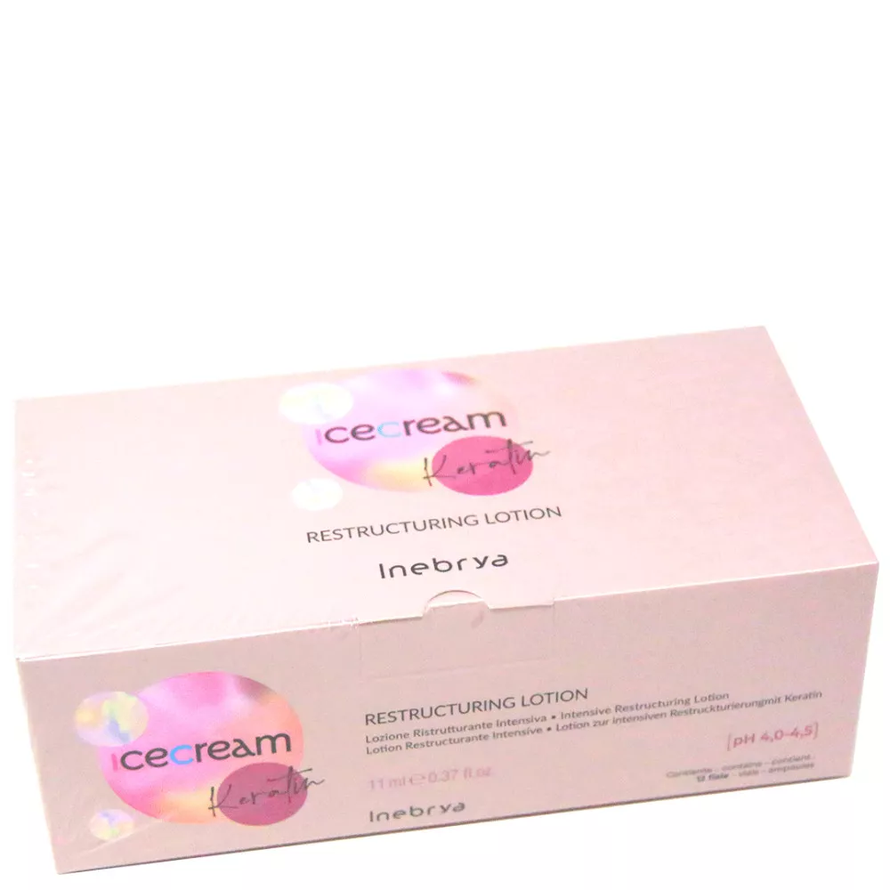 Intensywnie rekonstruujący lotion z keratyną Inebrya Ice Cream Keratin Restructuring Lotion w ampułkach to profesjonalny produkt przeznaczony do głębokiej odbudowy włosów zniszczonych, suchych i puszących się. Skoncentrowana formuła oparta na peptydach i keratynie nie tylko odżywia i wzmacnia włosy, ale także działa antystatycznie, nadaje im miękkość, blask i ułatwia rozczesywanie. Idealny do pielęgnacji po zabiegach chemicznych, takich jak rozjaśnianie, koloryzacja czy prostowanie. Lotion nie zawiera SLS, SLES ani siarczanów, co czyni go łagodnym nawet dla bardzo wrażliwych włosów. Opakowanie zawiera 12 ampułek po 11 ml każda, zapewniając wygodę i precyzję dozowania.