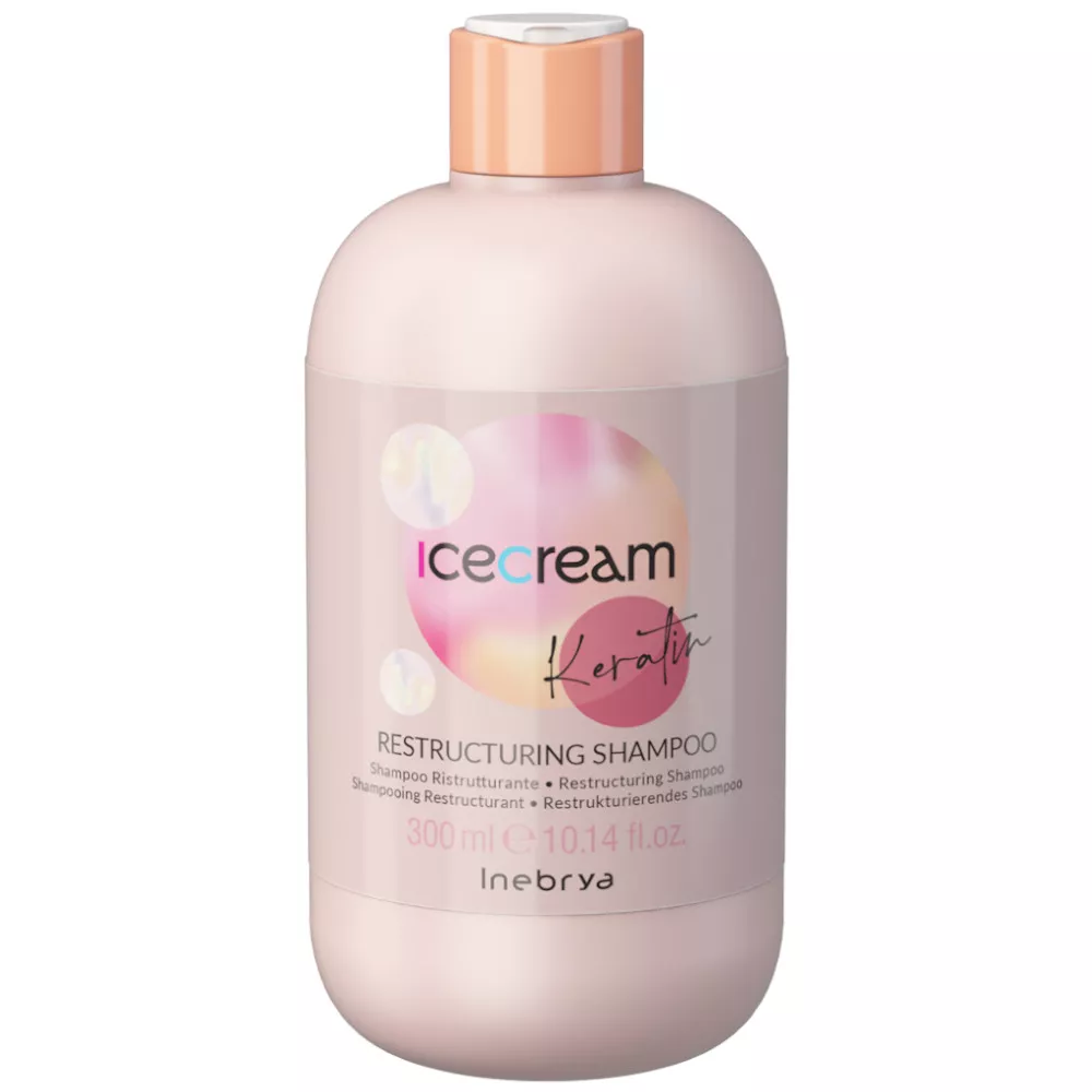 Inebrya Ice Cream Keratin to restrukturyzujący szampon do włosów z keratyną, stworzony specjalnie do pielęgnacji włosów puszących się, zniszczonych, łamliwych oraz po zabiegach chemicznych, takich jak rozjaśnianie, koloryzacja czy prostowanie. Jego formuła oparta na 92% składników pochodzenia naturalnego skutecznie oczyszcza włosy i skórę głowy, jednocześnie intensywnie nawilżając, odżywiając oraz wygładzając kosmyki. Szampon pomaga ujarzmić niesforne pasma, ogranicza puszenie, nadaje włosom blask oraz chroni je przed negatywnymi skutkami stylizacji i zabiegów chemicznych. Produkt nie zawiera SLS/SLES ani silikonów, dzięki czemu jest łagodny i bezpieczny dla włosów wymagających szczególnej troski.