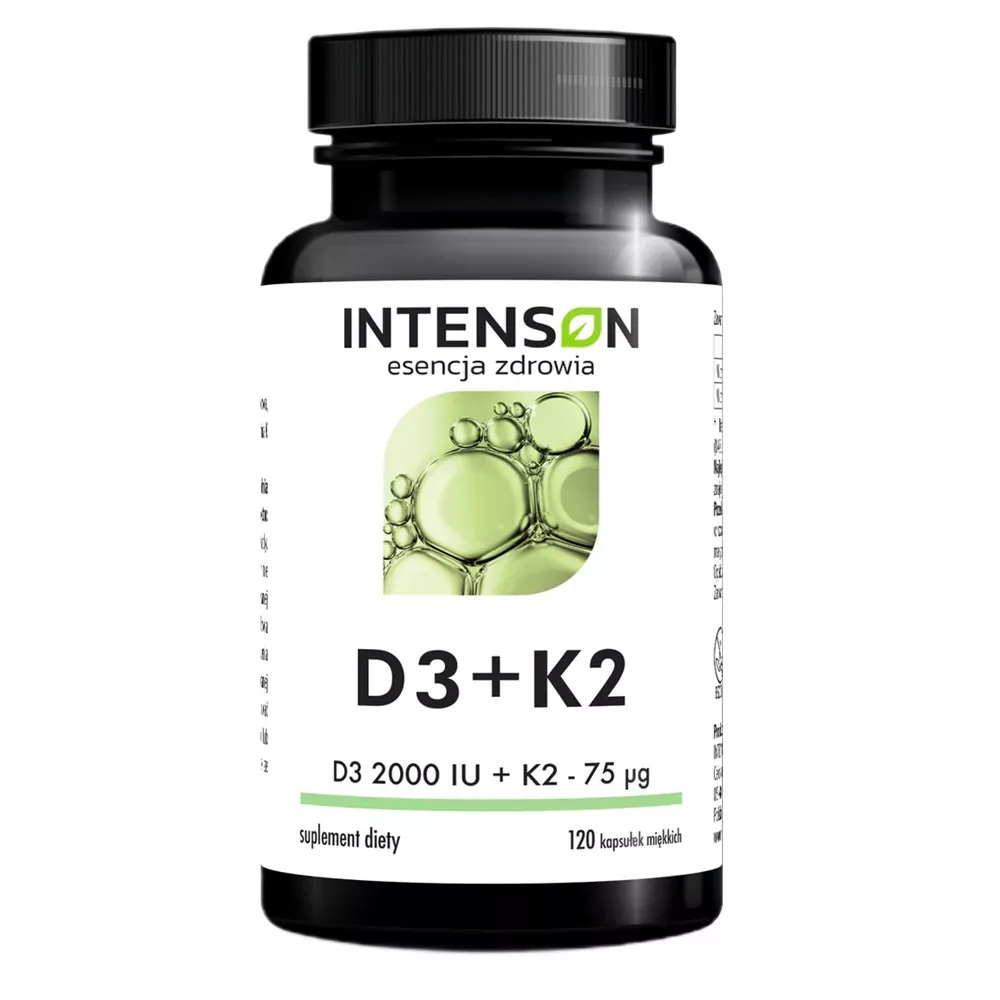 Intenson Witamina D3 + K2 suplement diety to innowacyjny produkt zawierający kluczowe dla zdrowia witaminy D3 i K2, które wspierają zdrowie kości i układu krwionośnego. Każda z 120 kapsułek dostarcza skuteczną dawkę cholekalcyferolu (D3) oraz menachinonu-7 (K2).
