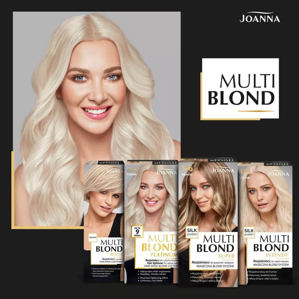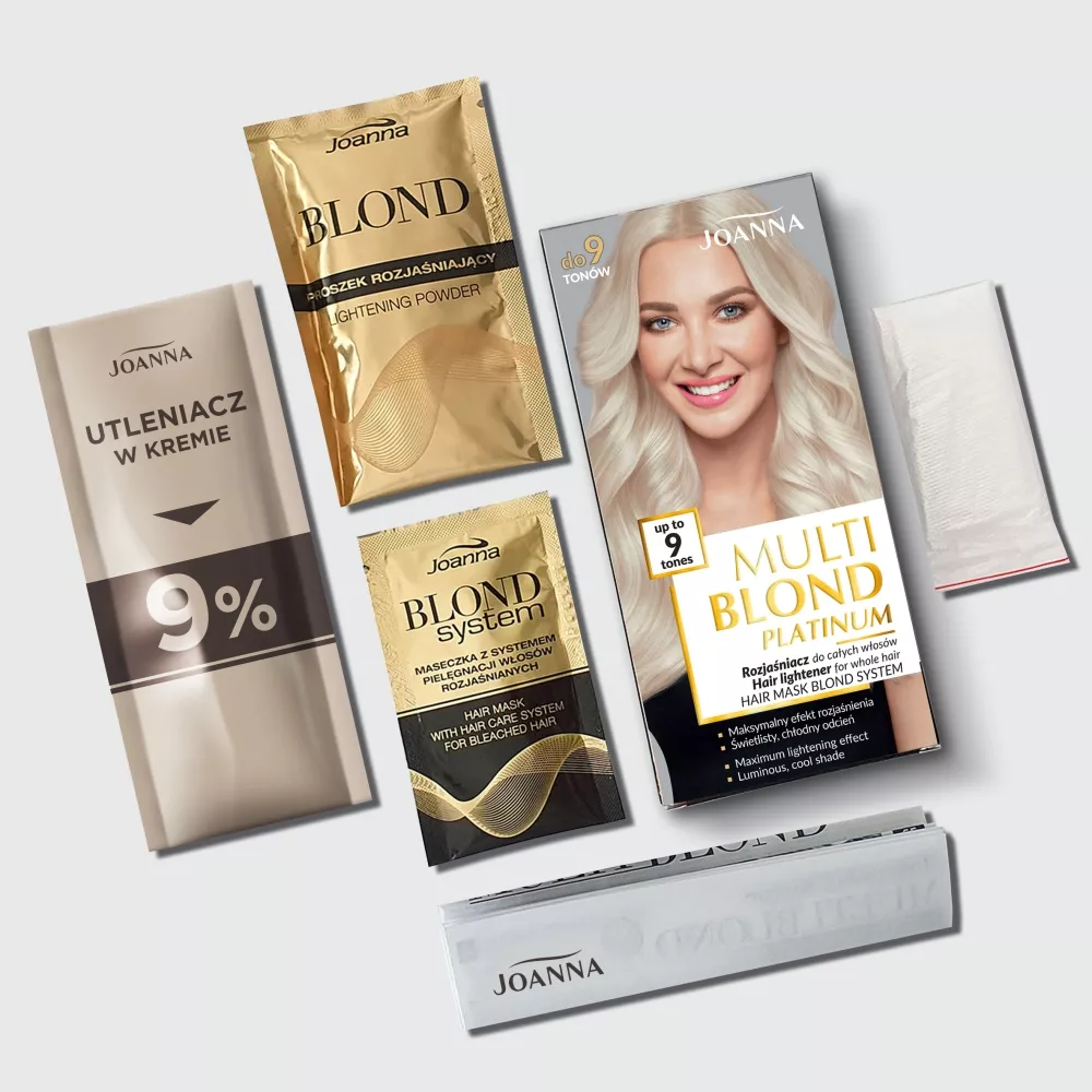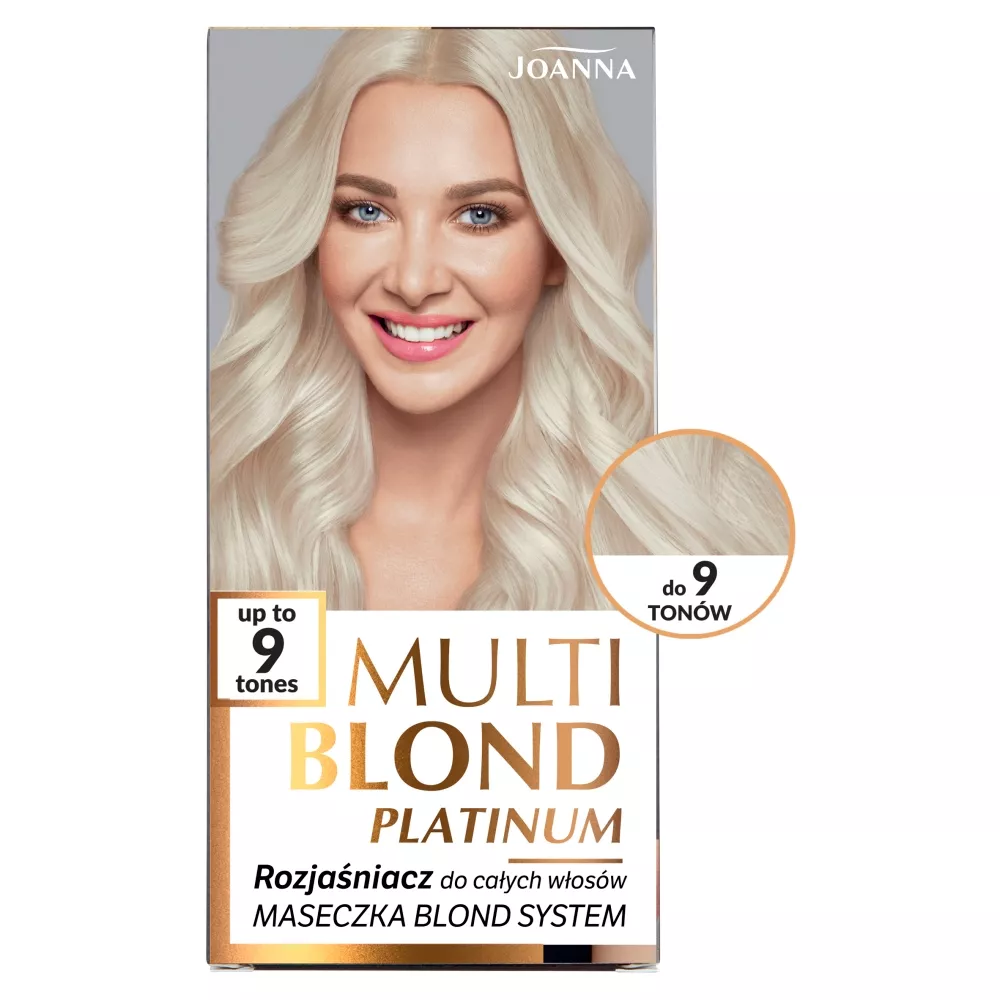 Joanna Multi Blond Platinum to rozjaśniacz do całych włosów, który zapewnia ekstremalną moc rozjaśniania, długotrwały blask i czystość koloru blond. Dzięki niemu można rozjaśnić włosy nawet do 9 tonów w ramach tylko jednego kroku. Produkt jest idealny zarówno do rozjaśniania całych włosów, jak i pasemek czy balejażu. Specjalnie opracowana maseczka Blond system zadba o kondycję włosów blond. Produkt został przetestowany dermatologicznie.