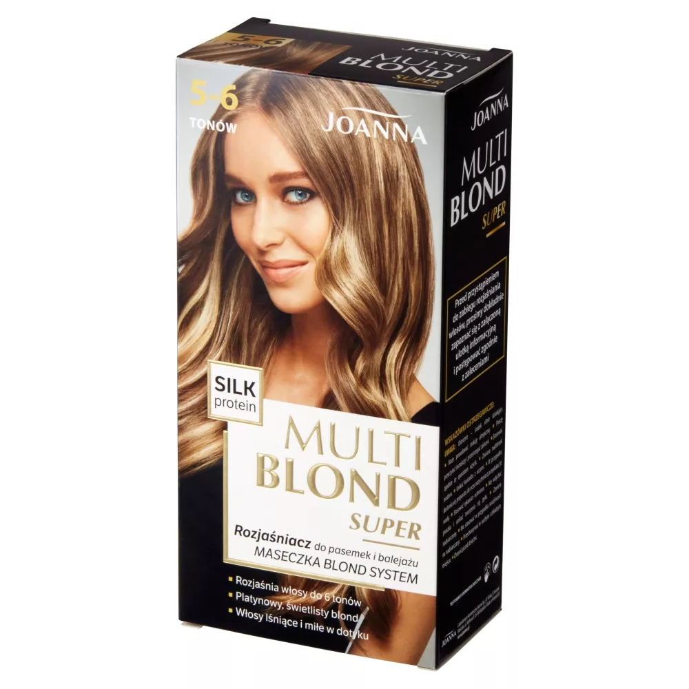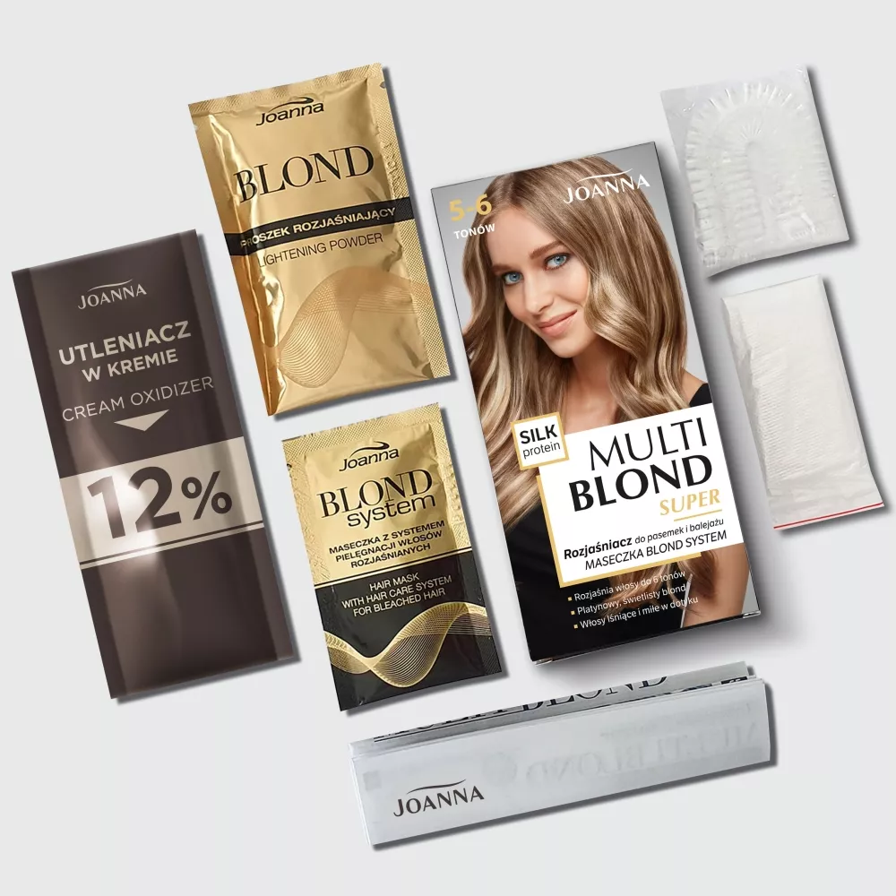 Joanna Multi Blond Super Rozjaśniacz do pasemek i balejażu pozwala osiągnąć doskonałe platynowe pasemka i balejaż, rozjaśniając włosy nawet o 5-6 tonów. Produkt gwarantuje trwały, chłodny odcień blond, który nadaje włosom piękno i blask. Dzięki zawartości protein jedwabiu, włosy są chronione już podczas zabiegu, zyskując satynową miękkość, jedwabistość i elastyczność. Dodatkowo, do zestawu dołączona jest maseczka Blond System, specjalnie opracowana do pielęgnacji włosów rozjaśnianych, aby zadbać o ich kondycję.